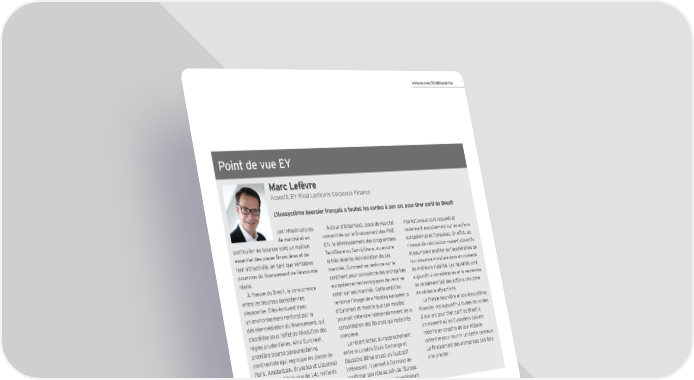 www.ey.com/fr/attractivite Point de vue EY Marc Lefèvre Associé, EY Ricol Lasteyrie Corporate Finance L’écosystème boursier français a toutes les cordes à son arc pour tirer parti du Brexit Les infrastructures Autour d’EnterNext, place de marché internationaux sont rassurés et de marché et en concentrée sur le financement des PME- reviennent massivement sur les actions particulier les bourses sont un maillon ETI, le développement des programmes européennes et françaises. En effet, les essentiel des places financières et de TechShare ou FamilyShare, ou encore niveaux de valorisation restent attractifs leur attractivité, en tant que véritables la très récente réorientation de ses et pourraient profiter de l’accélération de poumons du financement de l’économie marchés, Euronext se renforce sur le la croissance mondiale dans un contexte réelle. continent pour convaincre des entreprises de meilleure stabilité. Les liquidités sont À l’heure du Brexit, la concurrence européennes technologiques de venir se aujourd’hui considérables et la recherche entre les bourses européennes coter sur ses marchés. Cette ambition de rendement fait des actions une zone s’exacerbe. Elles évoluent dans renforce l’image de « Nasdaq européen » de véritable attractivité. un environnement renforcé par la d’Euronext et montre que son modèle La France boursière et son écosystème désintermédiation du financement, qui pourrait s’étendre indépendamment de la financier ont aujourd’hui toutes les cordes s’accélère sous l’effet de l’évolution des consolidation des Bourses qui reste très à leur arc pour tirer parti du Brexit à règles prudentielles. Ainsi Euronext, complexe. un moment où les Européens doivent première bourse paneuropéenne Le récent échec du rapprochement réécrire un chapitre de leur histoire continentale (qui regroupe les places de entre le London Stock Exchange et collective pour nourrir un destin commun. Paris, Amsterdam, Bruxelles et Lisbonne) Deutsche Börse en est un illustratif Le financement des entreprises doit être a apporté en 2016 plus de 141 milliards intéressant. Il permet à Euronext de une priorité ! d’euros de financement aux entreprises confirmer son rôle au sein de l’Europe contre 69 milliards en 2011. boursière à l’heure où les investisseurs Baromètre EY de l’attractivité de la France − Mai 2017 27