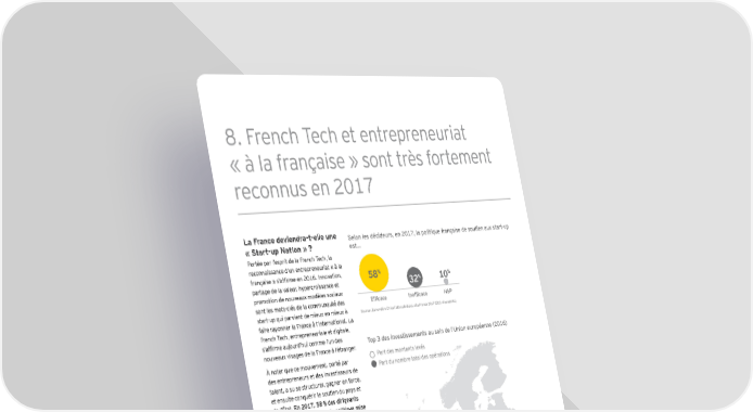 8. French Tech et entrepreneuriat « à la française » sont très fortement reconnus en 2017 La France deviendra-t-elle une Selon les décideurs, en 2017, la politique française de soutien aux start-up « Start-up Nation » ? est… Portée par l’esprit de la French Tech, la reconnaissance d’un entrepreneuriat « à la française » s’affirme en 2016. Innovation, 58% partage de la valeur, hypercroissance et 32% 10% promotion de nouveaux modèles sociaux sont les mots-clés de la communauté des Efficace Inefficace NSP start-up qui parvient de mieux en mieux à Source : Baromètre EY de l’attractivité du site France 2017 (203 répondants) faire rayonner la France à l’international. La French Tech, entrepreneuriale et digitale, s’affirme aujourd’hui comme l’un des Top 3 des investissements au sein de l’Union européenne (2016) nouveaux visages de la France à l’étranger. À noter que ce mouvement, porté par Part des montants levés des entrepreneurs et des investisseurs de Part du nombre total des opérations talent, a su se structurer, gagner en force, et ensuite conquérir le soutien du pays et de l’État. En 2017, 58 % des dirigeants interrogés estiment que la politique mise en œuvre pour encourager la création de start-up est efficace, soit 14 points de Royaume-Uni plus qu’en 2016. Cette appréciation est encore plus marquée parmi les entreprises 36% Allemagne non implantées, qui sont 66 % à saluer 24% 20% 16% cette politique. Parmi les entreprises implantées, la perception est plus mesurée, France signe d’un French bashing résistant : 20% 19% 40 % des dirigeants n’adhèrent pas à la politique mise en œuvre, et seuls 5 % ne se prononcent pas (contre 12 % en 2016). Source : Baromètre EY du capital risque en France (édition 2017) 28 Baromètre EY de l’attractivité de la France − Mai 2017