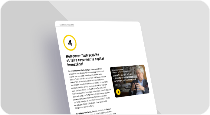 Les défis de l’attractivité 4 Retrouver l’attractivité et faire rayonner le capital immatériel Le rayonnement de la marque France peut être une clé de son attractivité économique, notamment Stéphane Lissner auprès des nouveaux investisseurs qu’elle peine Directeur de l’Opéra National de Paris aujourd’hui à convaincre pour ses mérites en matière Les défis de l’attractivité industrielle ou tertiaire. Les investisseurs chinois culturelle et immatérielle investissent massivement dans le secteur du tourisme, de la France à l’international dont l’illustration la plus marquante a été le passage 03:44 sous pavillon chinois du Club Med en janvier 2015. Ces investissements chinois, notamment dans l’hôtellerie de luxe (rachat de l’hôtel Marriott des Champs-Elysées par exemple) peuvent se transformer en création sur le sol français de fonctions stratégiques, à l’instar du groupe hôtelier chinois Jin Jiang qui a choisi d’implanter son QG à Paris. Au-delà du tourisme, d’autres secteurs révélateurs du rayonnement de l’art de vivre français permettent de fixer des emplois dans l’industrie ou la recherche, voire des centres de décision. C’est le cas du secteur de la mode et du textile, mais aussi de la cosmétique : par exemple, le groupe chinois EPO Fashion a choisi d’implanter son siège social à Paris et l’entreprise Jiangsu Longliqi Bioscience implante un laboratoire de recherche en région parisienne. Avec la filière culturelle enfin, la France a une carte à jouer pour renouer avec son influence et son soft power à l’international : ces dernières années, l’économie de la créativité s’est mieux portée que l’économie nationale, avec une augmentation de ses revenus supérieure à celle du PIB national. Avec 1,3 million d’emplois, les industries culturelles et créatives représentent plus du double des emplois de la production automobile et 8 fois ceux du secteur de la chimie. Dans la musique, le design, l’édition, le cinéma, le spectacle vivant, la France exporte, attire et innove tous les jours… 36 Baromètre de l'Attractivité de la France 2016