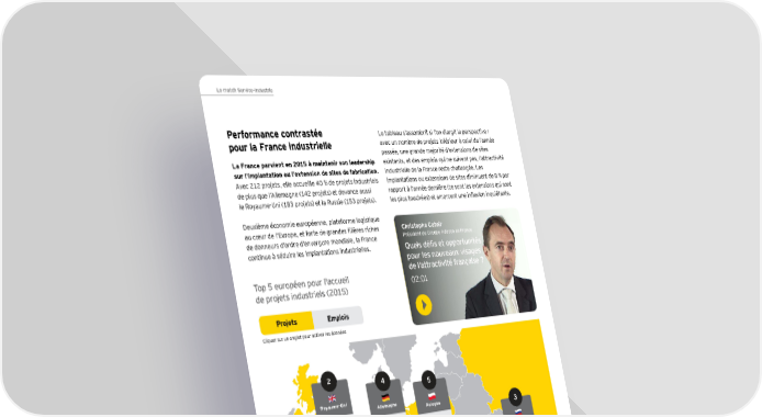 Le match Service-Industrie Performance contrastée Le tableau s’assombrit si l’on élargit la perspective : pour la France industrielle avec un nombre de projets inférieur à celui de l’année passée, une grande majorité d’extensions de sites La France parvient en 2015 à maintenir son leadership existants, et des emplois qui ne suivent pas, l’attractivité sur l’implantation ou l’extension de sites de fabrication. industrielle de la France reste challengée. Les Avec 212 projets, elle accueille 40 % de projets industriels implantations ou extensions de sites diminuent de 8 % par de plus que l’Allemagne (142 projets) et devance aussi rapport à l’année dernière (ce sont les extensions qui sont le Royaume-Uni (183 projets) et la Russie (153 projets). les plus touchées) et amorcent une inflexion inquiétante. Deuxième économie européenne, plateforme logistique au cœur de l’Europe, et forte de grandes filières riches Christophe Catoir de donneurs d’ordre d’envergure mondiale, la France Président du Groupe Adecco en France continue à séduire les implantations industrielles. Quels défis et opportunités pour les nouveaux visages Top 5 européen pour l'accueil de l’attractivité française ? de projets industriels (2015) 02:01 Projets Emplois Cliquer sur un onglet pour activer les données 2 4 5 Royaume-Uni Allemagne 183 Pologne 3 142 86 Russie 1 153 France 212 Source Global Investment Monitor, EY, 2016 Retrouver toutes les données 22 Baromètre de l'Attractivité de la France 2016