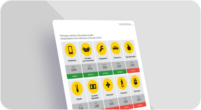 www.ey.com/attractiveness Principaux secteurs d'accueil de projets d'implantations internationales en Europe (2015) Numérique Services Équipement Automobile Agroalimentaire aux entreprises 2015 2015 2015 2015 2015 694 476 360 320 224 +6 % +27 % +15 % +11 % -2 % Chimie Services Pharmacie Plasturgie Électrique 2015 2015 2015 2015 2015 218 198 160 146 143 +12 % -8 % -5 % -3 % -18 % Source Global Investment Monitor, EY, 2016 Retrouver toutes les données Baromètre de l'Attractivité de la France 2016 11