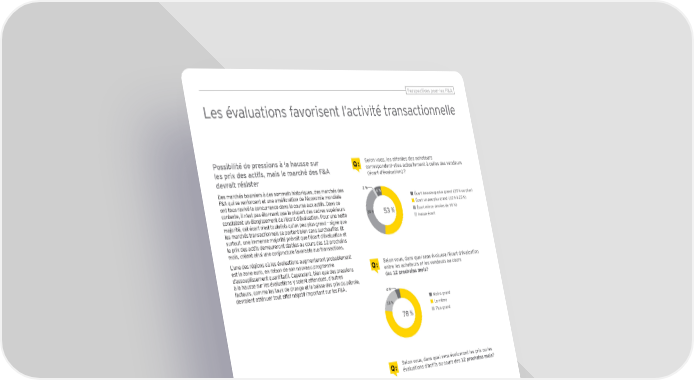 Perspectives pMo&uAr l oeuts Flo&oAk Les évaluations favorisent l’activité transactionnelle Possibilité de pressions à la hausse sur Q : Selon vous, les attentes des acheteurs les prix des actifs, mais le marché des F&A correspondent-elles actuellement à celles des vendeurs devrait résister (écart d’évaluation)? Des marchés boursiers à des sommets historiques, des marchés des 2 % 6 % F&A qui se renforcent et une amélioration de l’économie mondiale Écart beaucoup plus grand (25 % ou plus) ont tous ravivé la concurrence dans la course aux actifs. Dans ce Écart un peu plus grand (10 % à 25 %) contexte, il n’est pas étonnant que la plupart des cadres supérieurs 39 % 53 % Écart mince (moins de 10 %) constatent un élargissement de l’écart d’évaluation. Pour une nette Aucun écart majorité, cet écart n’est toutefois qu’un peu plus grand – signe que les marchés transactionnels se portent bien sans surchauffer. Et surtout, une immense majorité prévoit que l’écart d’évaluation et le prix des actifs demeureront stables au cours des 12 prochains mois, créant ainsi une conjoncture favorable aux transactions. L’une des régions où les évaluations augmenteront probablement est la zone euro, en raison de son nouveau programme Q : Selon vous, dans quel sens évoluera l’écart d’évaluation d’assouplissement quantitatif. Cependant, bien que des pressions entre les acheteurs et les vendeurs au cours à la hausse sur les évaluations y soient attendues, d’autres des 12 prochains mois? facteurs, comme les taux de change et la baisse des prix du pétrole, devraient atténuer tout effet négatif important sur les F&A. 4 % 18 % Moins grand Le même 78 % Plus grand Q : Selon vous, dans quel sens évolueront les prix ou les évaluations d’actifs au cours des 12 prochains mois? 17 % Augmentation 5 % Pas de changement 78 % Diminution Une immense majorité prévoit que l’écart d’évaluation et le prix des actifs demeureront stables au cours des 12 prochains mois, créant ainsi une conjoncture favorable aux transactions. Baromètre mondial de la confiance des entreprises | 11