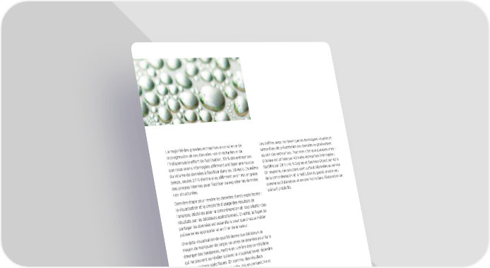 La majorité des grandes entreprises a conscience de Les chiffres nous montrent que les techniques visuelles et la progression de ces données non structurées et de interactives de présentation des données se généralisent l’indispensable effort de fiabilisation. 59 % des entreprises au sein des entreprises. Pour n’en citer que quelques-unes : que nous avons interrogées affirment anticiper une hausse Qlikview est utilisée par 43 % des entreprises interrogées ; du volume de données à fiabiliser dans les 18 mois. En même Spotfire par 28 % ; 41 % Cognos et Business Object par 43 %. temps, seules 27 % d’entre elles affirment avoir mis en place En revanche, ces solutions sont surtout déployées au service des process internes pour fiabiliser ou exploiter les données de la compréhension et la restitution du passé, encore peu non structurées. comme outil d’analyse, et encore moins dans l’élaboration de Dernière étape pour rendre les données clients exploitables : scénarii prédictifs. la visualisation et la simplicité d’usage des résultats de l’analyse, décisives pour la compréhension et l’exploitation des résultats par les décideurs opérationnels. En effet, la façon de partager les données est essentielle pour que chaque métier puisse se les approprier et en tirer de la valeur. Une data visualisation de qualité donne aux décideurs le moyen de manipuler de larges volumes de données pour faire émerger des tendances, mettre en lumière des corrélations qui ne peuvent se révéler qu’avec la visualisation et répondre à des questions spécifiques. En somme, des résultats d’analyse restitués de façon visuelle, mis en perspective et hiérarchisant les enjeux. La data visualisation permet aussi d’assurer une communication, interne et externe, efficace et cohérente (la visualisation de données unifie le discours en le rendant accessible, clair et facile à partager). Il s'agit donc d'un moyen efficace de faire passer un message sans ambiguïté auprès de ses clients, actionnaires et autres parties prenantes. Quelle maturité dans l'exploitation des données clients ? | 19