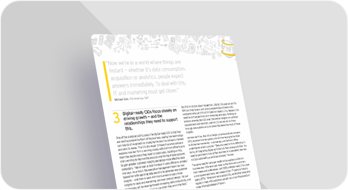 “ Now we’re in a world where things are instant — whether it’s data consumption, acquisition or analytics, people expect answers immediately. To deal with this, IT and marketing must get closer.” Michael Golz, CIO Americas, SAP Digital-ready CIOs focus closely on But this is not just about recognition. Digital CIOs also act on this: 59% say they have a very strong relationship with their CMO, 3driving growth — and the compared with just 37% of IT-intensive industry CIOs. Modern CIOs relationships they need to support need to be true partners with marketing and sales, forming an this. alliance whereby the CSO and CMO deliver insights on customer expectations and interests, and the CIO can deliver on these One of the standout points about the digital-ready CIO is that they through new systems and processes that make the most of these are looking toward the front of the business, seeing how technology insights. can help to drive growth by changing the way the company markets Herman de Prins, the CIO at Belgian pharmaceuticals company and sells its wares. The CIO of a major Chinese insurance company UCB, explains how he spends a lot of time helping to facilitate explains how her firm is working closely with the front office to give multichannel marketing — and making sure the front office them the mobile tools they need to boost sales. Building on this, understands what’s possible. “They also need to think differently in she’s working to improve the analysis and mining of data captured, terms of integrating digital activities into their analog activities. You to gain greater customer insights and design more effective sales need to get them to look at their business in a completely new way, campaigns. “We’ve seen a clear increase in sales efficiency already,” not just automating a particular process,” he says. she says. As a result, the executive management team has now The same need for stronger relationships applies outside the tasked her with applying data analytics to generate new customer business too. CIOs must get closer to the firm’s end customers, insights — and then to work with the business to apply those their needs and preferences. Half (52%) of digital-ready CIOs place insights to sales and marketing, and even product design. “All our a strong emphasis here, well ahead of their IT-intensive industry technology will be leaning toward increasing sales productivity, and peers (37%). “Whenever we’ve asked CIOs, we find that those who giving our agents more tools to use when they are in the field,” regularly meet with customers are still very much the exception,” she says. notes InformationWeek’s Preston. Clearly this implies a much closer emphasis on fostering relationships with the front of the business, rather than focusing predominantly on the back office. “We need to understand the company’s business operations deeply and both its front- and back-end processes,” says the CIO of a major Chinese telecommunications operator. Most obviously, while CIOs often fail to realize the value of their company’s external clients to their careers, digital-ready CIOs are far more engaged here. Nearly twice as many (59% versus 33% of IT-intensive industry CIOs) cite end clients as being strongly important to their career. Many others also realize the importance of roles such as the CMO or head of sales to their career. 24 | Born to be digital