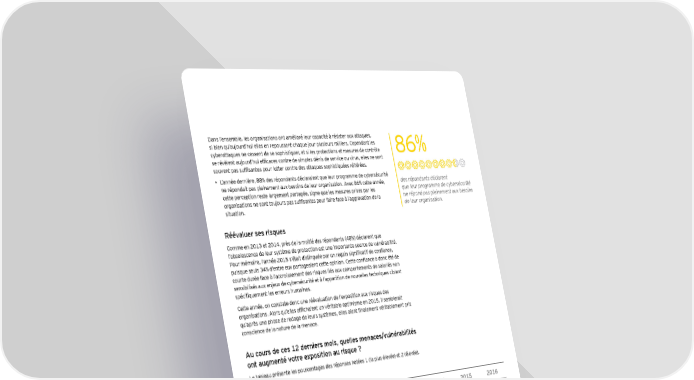Dans l’ensemble, les organisations ont amélioré leur capacité à résister aux attaques, si bien qu’aujourd’hui elles en repoussent chaque jour plusieurs milliers. Cependant les cyberattaques ne cessent de se sophistiquer, et si les protections et mesures de contrôle 86% se révèlent aujourd’hui efficaces contre de simples dénis de service ou virus, elles ne sont souvent pas suffisantes pour lutter contre des attaques sophistiquées réitérées. • L’année dernière, 88% des répondants déclaraient que leur programme de cybersécurité ne répondait pas pleinement aux besoins de leur organisation. Avec 86% cette année, des répondants déclarent cette perception reste largement partagée, signe que les mesures prises par les que leur programme de cybersécurité organisations ne sont toujours pas suffisantes pour faire face à l’aggravation de la ne répond pas pleinement aux besoins situation. de leur organisation. Réévaluer ses risques Comme en 2013 et 2014, près de la moitié des répondants (48%) déclarent que l’obsolescence de leur système de protection est une importante source de vulnérabilité. Pour mémoire, l’année 2015 s’était distinguée par un regain significatif de confiance, puisque seuls 34% d’entre eux partageaient cette opinion. Cette confiance a donc été de courte durée face à l’accroissement des risques liés aux comportements de salariés non sensibilisés aux enjeux de cybersécurité et à l’apparition de nouvelles techniques ciblant spécifiquement les erreurs humaines. Cette année, on constate donc une réévaluation de l’exposition aux risques des organisations. Alors qu’elles affichaient un véritable optimisme en 2015, il semblerait qu’après une phase de rodage de leurs systèmes, elles aient finalement véritablement pris conscience de la nature de la menace. Au cours de ces 12 derniers mois, quelles menaces/vulnérabilités ont augmenté votre exposition au risque ? Le tableau présente les pourcentages des réponses notées 1 (la plus élevée) et 2 (élevée), de 2013 à 2016. 2013 2014 2015 2016 Vulnérabilités Salariés non sensibilisés 53% 57% 44% 55% Systèmes obsolètes 51% 52% 34% 48% Accès sans autorisation 34% 34% 32% 54% Menaces Logiciels malveillants 41% 34% 43% 52% Phishing 39% 39% 44% 51% Cyberattaques conçues pour voler des informations financières 46% 51% 33% 45% Cyberattaques conçues pour voler des données ou de la propriété 41% 44% 30% 42% intellectuelle Attaques en interne 28% 31% 27% 33% e 19 édition de l’étude EY sur la sécurité de l’information (2016) | 13