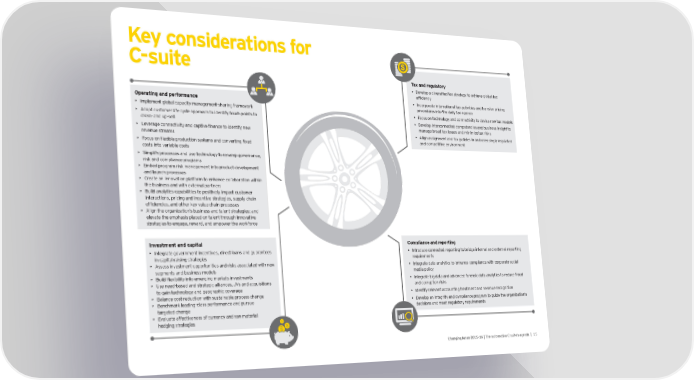 Key considerations for C-suite Tax and regulatory • Develop a diversified tax strategy to achieve global tax efficiency Operating and performance • Incorporate international tax activities and transfer pricing • Implement global capacity management-sharing framework procedures into the daily tax agenda • Adopt customer life cycle approach to identify touch points to • Focus on technology and connectivity to devise new tax models cross- and up-sell • Develop interconnected competencies and business insight to • Leverage connectivity and captive finance to identify new manage broad tax issues and minimize tax risks revenue streams • Align assignment and tax policies in an increasingly regulated • Focus on flexible production systems and converting fixed and competitive environment costs into variable costs • Simplify processes and use technology to revamp governance, risk and compliance programs • Embed program risk management into product development and launch processes • Create an innovation platform to enhance collaboration within the business and with external partners • Build analytics capabilities to positively impact customer interactions, pricing and incentive strategies, supply chain efficiencies, and other key value chain processes • Align the organization’s business and talent strategies; and elevate the emphasis placed on talent through innovative strategies to engage, reward, and empower the workforce Investment and capital Compliance and reporting • Integrate government incentives, direct loans and guarantees • Introduce connected reporting to bridge internal and external reporting in capital raising strategies requirements • Assess investment opportunities and risks associated with new • Integrate data analytics to enhance compliance with corporate social segments and business models media policy • Build flexibility into emerging markets investments • Integrate big data and advanced forensic data analytics to reduce fraud • Use need-based and strategic alliances, JVs and acquisitions and corruption risks to gain technology and geographic coverage • Balance cost reduction with sustainable process change • Identify relevant accounting treatment and revenue recognition • Benchmark leading-class performance and pursue • Develop an integrity and compliance program to guide the organization’s targeted change decisions and meet regulatory requirements • Evaluate effectiveness of currency and raw material hedging strategies Changing lanes 2015-16 | The automotive C-suite’s agenda | 15