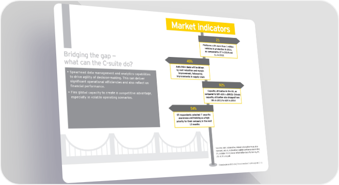 Market indicators 21 Platforms with more than 1 million vehicles in production in 2021, as compared to 17 in 2014 and 11 in 2011 Bridging the gap — 45% what can the C-suite do? Auto M&A deals will be driven by cost reduction and margin • Spearhead data management and analytics capabilities improvement, followed by improvements in supply chain to drive agility of decision-making. This can deliver signifi cant operational effi ciencies and also refl ect on 92% fi nancial performance. Capacity utilization in the US, as • Flex global capacity to create a competitive advantage, compared to 50%-60% in BRICS; China’s especially in volatile operating scenarios. capacity utilization also dropped from 78% in 2011 to 62% in 2014 54% Of respondents selected IT security awareness and training as a high priority for their company in the next 12 months Sources: LMC Automotive, Global Automotive Production Forecast, 4Q14; Automotive Capital Confi dence Barometer, EY, October 2014; Global Information Security Survey, EY, 2014; EY analysis Changing lanes 2015-16 | The automotive C-suite’s agenda | 11