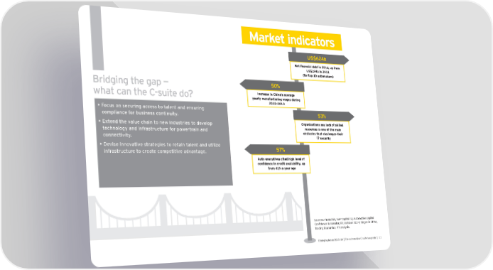Market indicators US$624b Net fi nancial debt in 2014, up from US$394b in 2011 (for top 10 automakers) Bridging the gap — 50% what can the C-suite do? Increase in China’s average yearly manufacturing wages during 2010-2013 • Focus on securing access to talent and ensuring 53% compliance for business continuity. • Extend the value chain to new industries to develop Organizations say lack of skilled technology and infrastructure for powertrain and resources is one of the main connectivity. obstacles that challenges their IT security • Devise innovative strategies to retain talent and utilize 57% infrastructure to create competitive advantage. Auto executives cited high level of confi dence in credit availability, up from 41% a year ago Sources: Financials, S&P Capital IQ; Automotive Capital Confi dence Barometer, EY, October 2014; Wages in China, Trading Economics; EY analysis. Changing lanes 2015-16 | The automotive C-suite’s agenda | 13