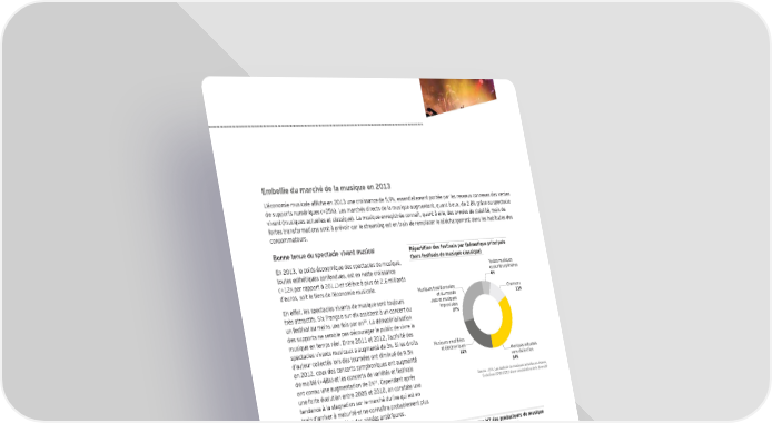 Embellie du marché de la musique en 2013 L’économie musicale afÕche en 2013 une croissance de 5,9, essentiellement portée par les revenus connexes des ventes de supports numériques (+25). Les marchés directs de la musique augmentent, quant à eux, de 2,8 grâce au spectacle vivant (musiques actuelles et classique). La musique enregistrée connaît, quant à elle, des années de stabilité, mais de fortes transformations sont à prévoir car le streaming est en train de remplacer le téléchargement dans les habitudes des consommateurs. Bonne tenue du spectacle vivant musical Répartition des festivals par thématique principale En 2013, le poids économique des spectacles de musique, (hors festivals de musique classique) toutes esthétiques confondues, est en nette croissance Toutes musiques (+12 par rapport à 2011) et s’élève à plus de 2,6 milliards et pluridisciplinaires 6% d’euros, soit le tiers de l’économie musicale. Musiques traditionnelles et du monde Chansons En effet, les spectacles vivants de musique sont toujours Jazz et musiques 11% très attractifs. Six Français sur dix assistent à un concert ou improvisées 30 27% un festival au moins une fois par an . La dématérialisation des supports ne semble pas décourager le public de vivre la musique en temps réel. Entre 2011 et 2012, l’activité des spectacles vivants musicaux a augmenté de 3 . Si les droits Emkaim]kYehdaÕ†]k d’auteur collectés lors des tournées ont diminué de 9,5 et électroniques en 2012, ceux des concerts symphoniques ont augmenté 22% Musiques actuelles de moitié (+48 sans distinction ) et les concerts de variétés et festivals 34% 31 ont connu une augmentation de 2 . Cependant après Source : CNV, Les festivals de musiques actuelles en France, une forte évolution entre 2005 et 2010, on constate une Évolutions 2008-2012 d’une constellation de la diversité tendance à la stagnation sur le marché du live qui est en train d’arriver à maturité et ne connaîtra probablement plus les croissances rapides des années antérieures. Hausse des revenus des producteurs de disque Évolution des revenus HT des producteurs de musique pour la première fois depuis 2002 enregistrée entre 2012 et 2013 : + 2,3% Alors que les revenus mondiaux des producteurs de Marché numérique Marché physique Droits voisins musique enregistrée ont Öéchi de 3,9 en 2013, ceux des producteurs français ont, pour la première fois depuis 2002, afÕché une croissance de 2,3 32 101 +9% 110 selon le SNEP. Les ventes de musique enregistrée physique ont quant à elles Öéchi de 16 entre 2011 et 2013, malgré la bonne tenue du répertoire francophone, qui s’élève à 60 363,7 +1% 367,4 des ventes de gros des producteurs de disque. Une nouvelle génération d’artistes a su séduire le public, de sorte que 17 des 20 meilleures ventes en France sont des albums 125 +0,6% 125,8 francophones. Pour la première fois depuis 2004, la meilleure vente d’albums dépasse le million d’exemplaires. 2012 2013 Ainsi, 2 albums ont été certiÕés « Double Diamant » Source : SNEP, 2014 (61 million) : Raz et Stromae et 4 albums ont été certiÕés « Diamant » (> 500 000 albums) : Johnny Hallyday, David Guetta, Daft Punk et Maître Gims. 30 MIDEM, Les Français et la musique, février 2014 31 Sacem, États des lieux du spectacle vivant en 2012 : Spectacle visant : l’atout numérique, avril 2013 32 SNEP Création sous tension 31