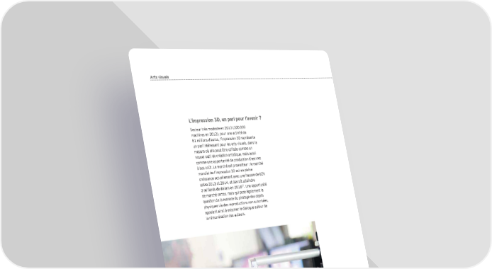 Arts visuels L’impression 3D, un pari pour l’avenir ? Secteur très modeste en 2013 (100 000 machines en 2012), pour une activité de 81 millions d’euros, l’impression 3D représente un pari intéressant pour les arts visuels, dans la mesure où elle peut être utilisée comme un nouvel outil de création artistique, mais aussi comme une opportunité de production d’œuvres à bas coût. Le marché est prometteur : le marché mondial de l’impression 3D est en pleine croissance actuellement avec une hausse de 62 entre 2013 et 2014, et devrait atteindre 27 3 milliards de dollars en 2018 . Une opportunité de marché certes, mais qui pose également la question de la menace du piratage des objets physiques via des reproductions non autorisées, appelant ainsi à entamer le dialogue autour de la rémunération des auteurs. 27 Global Industry Analysts (GIA), 3D Printing – A global strategic business report (2014) e 26 2 Panorama de l’économie de la culture et de la création en France