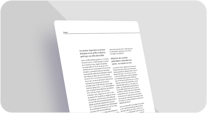 Presse Un secteur important en termes marque de presse en version numérique, dont d’emplois et de chiffre d’affaires, 19 millions de « mobinautes » et 9 millions 82 hgjl†hYjmf]g^^j]\an]jkaÔ†] d’utilisateurs de tablettes . Avec un chiffre d’affaires global de 11,3 milliards Réduction des recettes d’euros et plus de 110 000 employés, le secteur publicitaires, diminution des de la presse (journaux, magazine et agences ventes : un secteur en crise de presse) reste la 4e ICC en termes de chiffre e d’affaires (en recul d’une place) et la 5 en termes La presse écrite est frappée de plein fouet par d’emplois. La presse écrite dans son ensemble l’effondrement des revenus des ventes et des reste le premier poste de consommation culturelle recettes publicitaires. Respectivement, elles ont des Français en valeur avec 6,80279 milliards baissé de 5 et de 17 entre 2011 et 2013. d’euros en 2012 consommés annuellement dans Le recul de la diffusion de journaux physiques, les journaux, revues et périodiques. Cette activité dû à l’émergence des supports numériques reste devant les spectacles et les activités (sites d’information généralistes pour la presse artistiques (avec 4,735 milliards), mais en léger nationale, blogs et sites spécialisés), a eu de retrait par rapport à 2011 (-1,1). Cette appétence profondes répercussions sur les acteurs du pour la presse écrite se traduit par une audience secteur. Les investissements publicitaires se forte : 65 des Français, soit 33 millions sont en effet tournés vers d’autres supports d’individus, lisent chaque jour au moins un titre de diffusion, affectant l’équilibre Õnancier des 81 de presse écrite (quotidien ou magazine). Elle est médias traditionnels. Par ailleurs, les éditeurs alimentée par une offre toujours diversiÕée avec de journaux et de magazines sont confrontés à plus de 4 300 titres de presse disponibles en 2011. une hausse des coûts d’approvisionnement et de Malgré une réduction générale entre 2010 et distribution qui remet fortement en question leur 2011 (-3,6), principalement due à l’effondrement modèle économique83. de la presse gratuite d’annonces (-68,7), l’offre de presse continue de se développer, Dans ce contexte difÕcile, le secteur de la presse principalement pour la presse spécialisée grand a subi une forte baisse de ses effectifs (-8,4 public (+6,9) et la presse nationale d’information des emplois directs entre 2011 et 2013), ce générale et politique (+8). Cette appétence pour qui montre que cette industrie est en cours de la presse est aujourd’hui renforcée grâce à la transformation structurelle, et à la recherche déclinaison des marques sur les supports digitaux de nouveaux modèles organisationnels et : 33 millions de Français lisent au moins une économiques. Évolution des recettes publicitaires et des ventes en valeur pour la presse écrite entre 2011 et 2013 En milliards d’euros -5% Presse gratuite Presse payante -28% Ventes par abonnements Ventes au numéro -15% 1% -10% 2011 2012 2013 81 Audipresse, Etude ONE 2014 82 Audipresse ONE GLOBAL V2 2015 Source : Panorama de l’économie de la culture et de la création en France, 2015 83 XerÕ, La presse quotidienne nationale et régionale, 2014 e 74 2 Panorama de l’économie de la culture et de la création en France