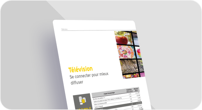 Télévision Télévision Se connecter pour mieux diffuser Impact économique Évolution Revenus 2011-2013 2013 Revenus des chaînes TV -3,2 9 514 M€ Ventes et location de vidéos "hors cinéma" en DVD/Blu-Ray -24 376 M€ Vidéo à la demande (VàD) +9 50 M€ 12,7 Mds € Ventes à l’export +8 249 M€ Revenus directs -3,9 10 190 M€* Ventes de matériels vidéo et tablettes tactiles -34 1 961 M€* Ventes de presse TV -8 502 M€ Revenus connexes -29,9 2 463 M€ TOTAL REVENUS -10,4% 12 652 M€* Évolution revenus 2011-2013 -10,4% Sources : Ministère de la Culture et de la Communication ; CNC ; INSEE ; GfK ; Audiens ; SACD ; SCAM. * arrondi e e 48 48 2 Panor2ama de l’ Panoraécma de l’onomie de la cultéconomie de la culture et de la crure et de la création en Féation en France rance