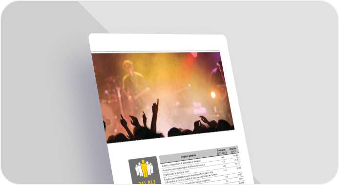 Emplois générés Évolution Emplois 2011-2013 2013 Auteurs, compositeurs et interprètes de musique +8 99 650 Producteurs phonographiques et éditeurs de musique -17 12 287 Emplois dans le spectacle vivant +2 77 773 241 813 Emplois dans les établissements Õnancés par le ministère de la +1 8 597 emplois Culture et de la Communication et dans les collectivités territoriales Emplois dans les points de vente de musique enregistrée -10 2 597 Emplois dans les TV et dans les radios musicales 0 2 814 Emplois dans les discothèques *** 30 984 Emplois directs +2,9 234 702 Emplois dans la fabrication d'instruments de musique +10 1 779 Emplois dans la vente de matériel audio +25 4 970 Évolution emplois Emplois dans la presse spécialisée musicale -5 362 2011-2013 Emplois connexes +19,3 7 111 +3,3% TOTAL EMPLOIS +3,3% 241 813 Sources : Ministère de la Culture et de la Communication ; INSEE ; SNEP ; Sacem. Création sous tension 29