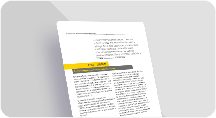 Comment la culture transforme les territoires « La présence d’institutions nationales à La Rochelle a attiré les artistes, et l’augmentation de la population artistique dans la ville a aidé à développer les associations et entreprises culturelles et créatives. Maintenant le territoire construit sur ces bases pour soutenir le développement d’une Õlière de transmédia à La Rochelle. » Renaud Planade, Directeur, Direction de l’Action Culturelle, Ville de La Rochelle FOCUS TERRITOIRE DYÕda‡j]aeY_]]ld]hYja\mljYfke†\aY€DYJg[`]dd] La ville de La Rochelle héberge une Õlière audiovisuel et Au-delà de cette offre de services et d’accueil généraliste, numérique (ImagéTic), représentant 130 entreprises pour la Õlière audiovisuelle de La Rochelle a développé environ 750 emplois (et 115 millions de chiffre d’affaires). progressivement un positionnement thématique Sur le secteur de l’audiovisuel, La Rochelle accueille à la fois différenciant : le transmédia. DéÕni comme « un processus les grands groupes français du secteur (dont le Groupe CGR, dans lequel les éléments d’une Õction sont dispersés sur e 3 circuit d’exploitation des salles de cinéma en France), diverses plateformes médiatiques dans le but de créer une 109 mais également des manifestations internationales, comme expérience de divertissement coordonnée et uniÕée », le le festival du Õlm documentaire Sunny side of the doc ou le transmédia permet une convergence et une différenciation Festival de la Õction TV. des contenus sur différents supports, laissant à l’utilisateur La ville de La Rochelle a mis en place plusieurs la possibilité d’enrichir son expérience de consommation. infrastructures d’accompagnement de la Õlière audiovisuelle Par construction, de tels procédés narratifs nécessitent avec un hôtel d’entreprise (1 000 m²), une pépinière une transversalité et une coordination forte entre les (300 m²), un espace de travail partagé dédié aux métiers acteurs audiovisuels. C’est le rôle du groupe « Médias et de l’image et du numérique, ainsi que 3 500 m² de studios numérique » implanté à La Rochelle. Il s’agit d’un pôle de de tournage équipés en plein cœur de la ville (les Studios de compétences qui rassemble tous les acteurs de l’audiovisuel 108 et du numérique, dans le but de soutenir les projets l’Océan) . collaboratifs et transversaux. L’appel à projets MooviN récompense toute initiative menée avec un acteur du pôle, aÕn d’attirer des acteurs innovants sur le territoire. FOCUS TERRITOIRE D]k¿[gfl]fmk]lmkY_]kfme†jaim]kÀ]fJ`‘f]%9dh]k$mf]Õda‡j]lgmjf†] vers l’international La Õlière « Contenus et usages numériques » en Rhône- Selon l’observatoire de la Õlière, plus de 9 entreprises sur Alpes fédère l’ensemble des acteurs régionaux de la 10 contribuent à la création de contenus liés à l’image au production et de la diffusion d’images réelles ou virtuelles. sens large et permet aux acteurs de la Õlière d’être présents Les 1 369 entreprises recensées génèrent au total un sur les marchés internationaux. Ainsi en moyenne, 44 chiffre d’affaires de 600 millions d’euros dans 5 marchés des entreprises de la Õlière ont une activité internationale applicatifs : le cinéma, l’audiovisuel, l’animation, le jeu vidéo à hauteur de 20 de leur volume d’affaires (principalement et le multimédia. Elles emploient 11 960 personnes en 2012 à destination de l’Europe). La création de contenus 110 culturels produit donc des externalités positives directes selon la dernière étude en date . Le pôle de compétitivité Imaginove est chargé de l’animation sur l’économie régionale : selon la Direction de la culture de cet écosystème. Il soutient les projets d’innovation de la région Rhône-Alpes, un euro investi dans un tournage collaborative. Depuis 2007, il a soutenu plus de 150 projets produit entre 4€ et 10€ de retombées économiques pour le territoire111. de R&D dans le secteur. 108 Communauté d’Agglomération de La Rochelle 109 Henry Jenkins, Convergence Culture, New York University Press (2006) 110 Contenus et usages numériques en Rhône-Alpes, Panorama 2012, Observatoire de la Õlière 2013 111 Entretien avec Isabelle Chardonnier, Directrice, Direction de la Culture, Région Rhône-Alpes e 98 2 Panorama de l’économie de la culture et de la création en France