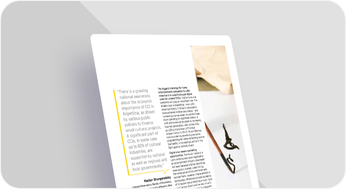 É L`ere is a _rooin_ The biggest challenge for home nationad aoareness entertainment companies in Latin America is to substitute paid digital about t`e econoeic sales for pirated DVDs. D igit al t ools and plat forms w ill play an import ant role. T h e iehortance o^ ;;A in middle class is ex panding — one Lat in 9r_entina$ as s`oon American family in t h ree is reck oned t o h ave ach ieved middle class st at u s — and bq narious hubdic increasing b u y ing pow er sh ou ld facilit at e hodicies to Õnance more spending on legit imat e videos. A sh ift online sh ou ld b e aided b y increasing seadd cudturad hrobects& int ernet penet rat ion, w it h online visit s 9 si_niÕcant hart o^ u p 1 2 % t o more t h an 1 4 7 million u niq u e visit ors in 2 0 1 3 . G ru po T elevisa, ;;As$ in soee case now considering developing ex clu sive uh to 0( o^ cudturad programming for video- st reaming service lice FetÖip$ ik increakin_ly active in t`e in\ustries$ are fi_`t a_ainkt content hiracy& suhhorte\ bq nationad Digital also means marketing as oedd as re_ionad an\ opportunities. T h e mu sic indu st ry in Lat in America w as once regarded as docad _onerneents&Ê an ent ert ainment indu st ry b ack w at er, not least b ecau se original recordings w ere q u ick ly pirat ed, u ndermining H ector S hargorodsky t h e revenu es of art ist s and t h ose w h o b ack ed t h em. H ow ever, improvement s in Cultural Observatory, Faculty of Economics, t ech nology , infrast ru ct u re and st andards University of Buenos Aires of living are now prompt ing a mu sic “ gold ru sh ” across B raz il and t h e rest of Lat in goods are est imat ed t o generat e sales of America. It is mu ch easier t o ch arge for U S $ 1 0 m a day , w h ile a t ot al of U S $ 5 0 0 m live performances, and b ig ent ert ainment a y ear of pirat ed D V D s are sold in B raz il companies are b eginning t o t ak e a close and M ex ico. int erest in t h e region’ s st ars. Digital recorded music revenue growth in L atin A merica ( U S $ m) 1 8 2 1 4 3 9 4 8 1 6 1 2 0 0 9 2 0 1 0 2 0 1 1 2 0 1 2 2 0 1 3 S ou rce: IF P I, 2 0 1 4 | Cultural times L`e Õrst _dobad eah o^ cudturad an\ creatine in\ustries .-