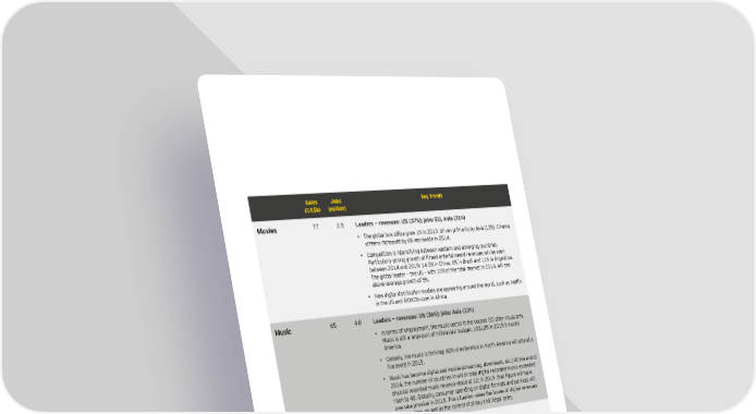 S ales J obs K ey trends ( U S $ b) ( million) Eonies 7 7 2 . 5 L eaders — revenues: U S ( 3 7 % ) ; j obs: E U , A sia ( 3 1 % ) • L`e _loZal Zop office _reo ) in *()+$ driven hriearily Zy 9kia )*!& ;ineea screens increased b y 6 % w orldw ide in 2 0 1 4 . • Compet it ion is int ensify ing b et w een w est ern and emerging cou nt ries. Harticmlarly ktron_ _root` of fileed entertaineent revenmek oill Ze keen b et w een 2 0 1 4 and 2 0 1 9 : 1 4 . 5 % in Ch ina, 6 % in B raz il and 1 1 % in Argent ina. T h e glob al leader — t h e U S — w it h 3 3 % of t h e t ot al mark et in 2 0 1 4 , w ill see ab ove- average grow t h of 5 % . • Feo di_ital diktriZmtion eodelk are ahhearin_ aromnd t`e oorld$ kmc` ak FetÖip in t h e U S and iR O K O t v. com in Africa. Eusic 6 5 4 . 0 L eaders — revenues: U S ( 3 6 % ) ; j obs: A sia ( 3 3 % ) • In t erms of employ ment , t h e mu sic sect or is t h e second CCI aft er visu al art s. M u sic is st ill a large part of millennials’ b u dget : U S $ 1 2 5 in 2 0 1 5 in N ort h America. • G lob ally , live mu sic is t h riving: 8 0 % of millennials in N ort h America w ill at t end a live event in 2 0 1 5 . • M u sic h as b ecome digit al and mob ile ( st reaming, dow nloads, et c. ) At t h e end of 2 0 1 4 , t h e nu mb er of cou nt ries in w h ich t ot al digit al recorded mu sic ex ceeded h`ykical recorded emkic revenme ktood at **3 in *()1$ t`at fi_mre oill `ave risen t o 4 0 . G lob ally , consu mer spending on digit al format s and services w ill overt ak e ph y sical in 2 0 1 5 . T h is sit u at ion raises t h e issu es of digit al revenu es’ monet iz at ion, as w ell as t h e cont rol of piracy and illegal sales. Ja\io 4 6 0 . 5 L eaders — revenues: U S ( 4 5 % ) ; j obs: A sia ( 3 5 % ) • G lob ally a popu lar mediu m, radio is h ere t o st ay . R adio advert ising revenu es w ill ex t end it s sh are of t ot al glob al radio revenu e from 7 5 . 3 % in 2 0 1 4 t o 7 5 . 8 % in 2 0 1 9 . • T h e U S dominat es t h e glob al radio mark et , w it h 4 6 % of all revenu e. H ow ever, grow t h is now occu rring more q u ick ly in ot h er mark et s. • In emerging cou nt ries, non- t radit ional models su ch as commu nit y radios prosper, especially in Africa, e. g. , ab ou t 2 4 0 commu nit y st at ions operat e in S ou t h Africa. S mall, local and commu nit y - driven, t h ey h elp develop cu lt u ral diversit y , b roadcast new s, spread mu sic and produ ce cont ent . | Cultural times L`e Õrst _dobad eah o^ cudturad an\ creatine in\ustries 9 3