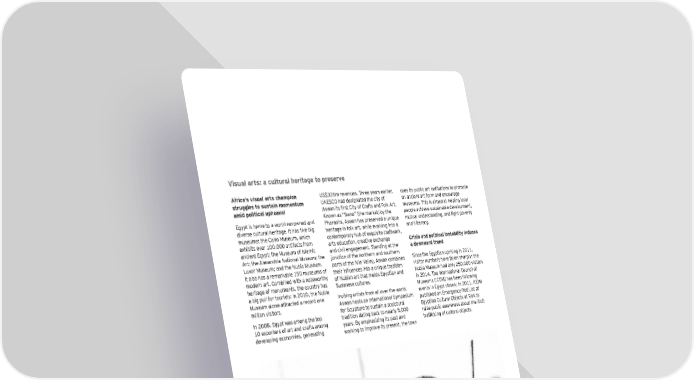 V isual arts: a cultural heritage to p reserve A frica’ s visual arts champ ion U S $ 3 2 6 m revenu es. T h ree y ears earlier, u ses it s pu b lic art inst it u t ions t o promot e struggles to sustain momentum U N E S CO h ad designat ed t h e cit y of an ancient art form and encou rage amid p olitical up heaval 9koan itk firkt ;ity of ;raftk and >olc 9rt& mu seu ms. T h is is aimed at h elping local E gy pt is h ome t o a w orld- renow ned and K now n as “ S w no” ( t h e mark et ) b y t h e people ach ieve su st ainab le development , diverke cmltmral `erita_e& At `ak five Zi_ P h araoh s, Asw an h as preserved a u niq u e emtmal mnderktandin_$ and fi_`t hoverty mu seu ms: t h e Cairo M u seu m, w h ich h erit age in folk art , w h ile evolving int o a and illit eracy . ex h ib it s over 1 0 0 , 0 0 0 art ifact s from cont emporary h u b of ex q u isit e craft w ork , ancient E gy pt ; t h e M u seu m of Islamic art s edu cat ion, creat ive ex ch ange Crisis and p olitical instability induces Art ; t h e Alex andria N at ional M u seu m; t h e and civil engagement . S t anding at t h e a downward trend Lu x or M u seu m; and t h e N u b ia M u seu m. j u nct ion of t h e nort h ern and sou t h ern S ince t h e E gy pt ian u prising in 2 0 1 1 , It also h as a remark ab le 1 5 0 mu seu ms of part s of t h e N ile V alley , Asw an comb ines visit or nu mb ers h ave fallen sh arply : t h e modern art . Comb ined w it h a not ew ort h y t`eir inÖmencek into a mniime tradition N u b ia M u seu m h ad only 2 5 0 , 0 0 0 visit ors h erit age of monu ment s, t h e cou nt ry h as of N u b ian art t h at melds E gy pt ian and in 2 0 1 4 . T h e Int ernat ional Cou ncil of a b ig pu ll for t ou rist s: in 2 0 1 0 , t h e N u b ia S u danese cu lt u res. M u seu ms ( ICO M ) h as b een follow ing M u seu m alone at t ract ed a record one Invit ing art ist s from all over t h e w orld, event s in E gy pt closely . In 2 0 1 1 , ICO M million visit ors. Asw an h ost s an Int ernat ional S y mposiu m pu b lish ed an E mergency R ed List of In 2 0 0 8 , E gy pt w as among t h e t op for S cu lpt u re t o su st ain a scu lpt u ral E gy pt ian Cu lt u ral O b j ect s at R isk t o 1 0 ex port ers of art and craft s among t radit ion dat ing b ack t o nearly 5 , 0 0 0 raise pu b lic aw areness ab ou t t h e illicit developing economies, generat ing y ears. B y emph asiz ing it s past and trafficcin_ of cmltmral oZbectk& w ork ing t o improve it s present , t h e t ow n | Cultural times L`e Õrst _dobad eah o^ cudturad an\ creatine in\ustries 7 7