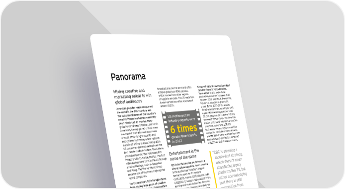 Hanoraea Eixin_ creatine an\ b roadcast arou nd t h e w orld and oft en Growth of cultural and creative output earketin_ tadent to oin ac`ieve _loZal Zop office kmccekk$ remains strong in North America. w h ich movies from ot h er regions V alu e added b y art s and cu lt u ral _dobad au\iences ktrm__le to eemlate& L`e MK%eade file produ ct ion indu st ries increased 3 . 8 % Avatar earned Zop office revenmek of b et w een 2 0 1 2 and 2 0 1 3 . T h e gaming American popular music conquered almost U S $ 2 b . indu st ry is ex pect ed t o grow 6 . 1 % the world in the 20th century and a y ear du ring 2 0 1 3 - 2 0 1 8 , and t h e the cultural influence of the country’s fileed entertaineent indmktry Zy ,&, creative industries has more recently MK eotion hicture a y ear. U S advert ising agencies h ired been reinforced by movies. M any in\ustrq exhorts oere 3 0 , 0 0 0 people in 2 0 1 3 as t h e indu st ry glob al ent ert ainment leaders are N ort h recovered from a slu mp. T h e American American, h aving gained crit ical mass mot ion pict u re and t elevision produ ct ion in a mark et t h at afforded economies 6 times indu st ries, comprising 1 0 8 , 0 0 0 of scale amid rising prosperit y and b u sinesses, remain h igh ly compet it ive ent h u siasm t o develop a new nat ional _reater t`an iehorts w orldw ide. N ort h American au diences ident it y at a t ime of mass immigrat ion. in *()* hrovide +1 of oorld revenmek froe file U S consu mer demand u nderpinned t h e produ ct ion and dist rib u t ion, compared firkt eovie ktmdio in `iktory$ :lacc Earia$ w it h 2 3 % for t h eir E u ropean cou sins. and kmZkeimently$ t`e @ollyoood file indmktry oit` itk kip Zi_ ktmdiok& L`e firkt =ntertaineent is t`e video games w ere b orn in t h e U S t h rou gh naee o^ t`e _aee É ;:; is a\ohtin_ a arcade offerings, su ch as SpaceWar eobide%Õrst strate_q$ and Pong. T h e W arner M u sic G rou p CCI in North America are driven by a b ecame one of t h e t h ree maj or glob al strong cultural appetite. N ort h America o`ic` \oesnt eean record companies. is t h e au diovisu al indu st ry ’ s b iggest aban\onin_ de_acq North America’s CCI strength stems mark et b y sales for T V cont ent from mixing large pools of creative ( U S $ 1 8 2 b ) , movies ( U S $ 2 8 b ) and radio hdat^ores dike LN$ but and marketing talent. Script writers ( U S $ 2 0 b ) . It is also a h eavy w eigh t in t h e rat`er acknoode\_in_ schools clearly constitute a competitive gaming and mu sic indu st ries: it s mu sic advantage for the Hollywood industry. indu st ry sect or ( live and recorded) h as t`at t`ere is sti^^ T h e U S is a net cu lt u ral ex port er in most annu al sales of U S $ 2 3 . 7 b , 3 6 % of t h e coehetition ^roe sect ors. S ales of U S copy righ t - b ased glob al t ot al. cmltmral hrodmctk$ inclmdin_ filek$ LN$ N ort h America is also t h e leader in t h e ot`er eeer_in_ video, recorded mu sic, new spapers, performing art s ( U S $ 6 1 . 5 b ) w it h a hdat^ores in t`e b ook s, magaz ines and soft w are in pronou nced craving for mu sical sh ow s. increasin_dq overseas mark et s t ot aled U S $ 1 5 6 . 3 b T h is is illu st rat ed b y t h e su ccess of t h e in 2 0 1 3 . T h ey t opped t h e foreign sales S u perb ow l mid- game sh ow ( and it s \isharate broa\cast of many ot h er maj or U S indu st ries u niq u e and ex pensive T V commercials) inclu ding ch emicals ( U S $ 1 4 7 . 8 b ) , and t h e dy namic live mu sic indu st ry in earkethdace&Ê aerospace produ ct s and part s O nt ario, Canada, w h ich h as b een grow ing ( U S $ 1 2 8 . 3 b ) , agricu lt u re ( U S $ 6 8 . 9 b ) , 6 . 5 % a y ear since 2 0 1 0 . In 2 0 1 3 , 3 of and ph armaceu t icals ( U S $ 5 1 . 6 b ) . t h e 1 0 b iggest mu sic fest ivals w ere in t h e Canadian TV expert American culture exerts strong U S : U lt ra ( M iami) , Coach ella ( California) influence worldwide, and convey s soft and S u mmerfest ( W isconsin) . pow er. American movies are w idely | Cultural times L`e Õrst _dobad eah o^ cudturad an\ creatine in\ustries --