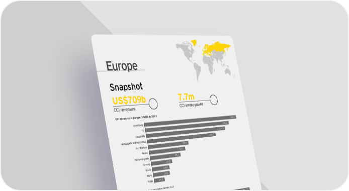 =urohe Knahs`ot U S $ 7 0 9 b 7 . 7 m ;;A renenues ;;A eehdoqeent CCI revenues in E urop e ( U S $ b) in 2 0 1 3 Advert ising 1 4 3 .7 T V 1 2 9 .2 V isu al art s 1 2 1 .5 N ew spapers and magaz ines 1 0 4 .1 Arch it ect u re 5 9 .0 B ook s 5 2 . 5 P erforming art s 4 4 . 0 G aming 2 9 .8 M ovie 2 4 .4 M u sic 2 3 . 5 R adio 1 4 .5 S ou rce: E Y analy sis of cu lt u ral and creat ive mark et s, 2 0 1 5 CCI j obs in E urop e in 2 0 1 3 ( U S $ b) M u sic 1 , 2 8 9 ,0 0 0 P erforming art s 1 ,1 8 3 , 0 0 0 Advert ising 1 ,0 2 8 ,0 0 0 B ook s 9 7 3 , 0 0 0 V isu al art s 8 0 3 , 0 0 0 T V 7 4 6 , 0 0 0 M ovie 7 0 4 ,0 0 0 Arch it ect u re 6 6 1 , 0 0 0 N ew spapers and magaz ines 6 0 4 , 0 0 0 R adio 1 1 5 ,0 0 0 G aming 9 2 ,0 0 0 S ou rce: E Y analy sis of cu lt u ral and creat ive mark et s, 2 0 1 5 T ot al for j ob s and revenu es h ave b een est imat ed aft er removal of dou b le- cou nt ing. T h e su m of each sect or ex ceeds t h e consolidat ed t ot al as some cu lt u ral act ivit ies are cou nt ed in t w o sect ors ( for inst ance, live mu sic is inclu ded in “ M u sic” and in “ P erforming art s” ) . | ,, Cultural times L`e Õrst _dobad eah o^ cudturad an\ creatine in\ustries