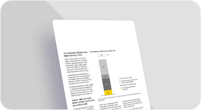 ;;A contribute\ MK*((b to t`e T he wellsp rings of digital revenue, U S $ b, 2 0 1 3 \i_itad econoeq in *()+ 1 9 8 . 6 T ot al D igit al cu lt u ral goods are, b y far, t h e b iggest revenu e sou rce for t h e digit al economy , generat ing U S $ 6 6 b of B 2 C sales ( eb ook s, mu sic, video, games) in 2 0 1 3 and U S $ 2 2 b of advert ising revenu es for online media and free 8 5 . 1 st reaming w eb sit es su ch as Y ou T u b e. Cu lt u ral goods and event t ick et s are increasingly sold on int ernet plat forms via e%retailerk and online clakkifiedk$ 2 1 . 7 generat ing U S $ 2 6 b in sales and driving t h e grow t h of t h e online economy . D igit al advert ising creat ion O nline advert isement s provided U S $ 8 5 b Advert ising revenu es for online media in revenu es for advert ising agencies in 6 5 . 6 and free st reaming w eb sit es 2 0 1 3 . T h e online migrat ion is driving D igit al cu lt u ral cont ent B 2 C sales agencies t o develop new sk ills in video, P h y sical cu lt u ral goods sold on cont ent produ ct ion and st ory t elling. t h e int ernet 2 6 . 3 9ut`orsÌ ri_`ts an\ \i_itad \enices2 hrinate cohqin_ denies S ou rce: E Y analy sis, M AG N A G LO B AL ( 2 0 1 5 ) , T h omson R eu t ers ( 2 0 1 5 , Y ou T u b e ( 2 0 1 5 ) , D aily mot ion ( 2 0 1 5 ) , are a tren\in_ tohic S pot ify ( 2 0 1 5 ) P rivat e copy ex cept ions t o au t h ors’ of t h eir w ork s, in ex ch ange for a fair devices ( su ch as CD s and D V D s) and righ t s/ copy righ t s and neigh b oring compensat ion ( a fee t ak en on each st orage capacit ies on ph ones, t ab let s ri_`tk conktitmtek t`e only efficient and copy ing device) , t h u s allow ing t h e pu b lic and compu t ers and are massively u sed operat ional w ay t o t ransfer part of t h e t o legally copy t h eir w ork s for t h eir ow n t o copy cu lt u ral w ork s. valu e creat ed b y cu lt u ral w ork s from mke& At Zenefitk Zot` t`e hmZlic and t`e T h e ch allenge is t h at in many cou nt ries digit al play ers t ow ard t h e creat ors of manu fact u rers of copy ing devices ( as t h e t h is sy st em does not ex ist . In ot h er t h ese w ork s. devices w ou ld h ave mu ch less int erest cou nt ries act s of privat e copy are P rivat e copy is a legal concept invent ed w it h ou t creat ive w ork s t o copy ) w h ile permit t ed b u t no compensat ion is in G ermany in 1 9 6 5 , at t h e t ime w h en not neglect ing t h e need t o compensat e grant ed t o creat ors ( t h e U K ) . T h is magnet ic copy ing mach ines ( for mu sic) creat ors for t h e u se of t h eir righ t s. means b illions of dollars or eu ros lost w ere invent ed and people w ou ld b u y T h e privat e copy ing levies sy st em for creat ors w h ose w ork s are copied for t h em t o copy mu sic from t h e radio for proved adapt ab le and w as, t h erefore, people’s u se and ent ert ainment w it h ou t t h eir personal u se. adopt ed in many cou nt ries; 5 2 cou nt ries any compensat ion. T h e G ermans creat ed an ex cept ion t o w orldw ide h ave a privat e copy ex cept ion au t h ors’ righ t s b y w h ich creat ors w aive now aday s, inclu ding B u rk ina F aso and t h eir righ t t o au t h oriz e/ forb id t h e u se 9l_eria& At hrovek harticmlarly efficient in t h e digit al age, w h ere b lank copy ing | *( Cultural times L`e Õrst _dobad eah o^ cudturad an\ creatine in\ustries