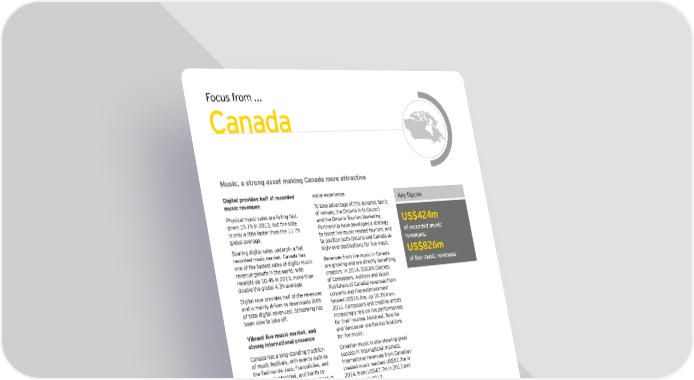 F ocu s from . . . ;ana\a M usic, a strong asset making Canada more attractive Digital p rovides half of recorded social ex perience. Keq Õ_ures music revenues T o t ak e advant age of t h is dy namic fab ric P h y sical mu sic sales are falling fast , of venu es, t h e O nt ario Art s Cou ncil dow n 1 5 . 1 % in 2 0 1 3 , b u t t h e slide and t h e O nt ario T ou rism M ark et ing U S $ 4 2 4 m is only a lit t le fast er t h an t h e 1 1 . 7 % P art nersh ip h ave developed a st rat egy glob al average. t o b oost live- mu sic- relat ed t ou rism, and o^ recor\e\ eusic Koarin_ di_ital kalek mnderhin a Öat t o posit ion b ot h O nt ario and Canada as renenues3 recorded mu sic mark et . Canada h as h igh - level dest inat ions for live mu sic. U S $ 8 2 6 m one of t h e fast est rat es of digit al mu sic R evenu es from live mu sic in Canada revenu e grow t h in t h e w orld, w it h are _rooin_ and are directly Zenefitin_ o^ dine eusic renenues receipt s u p 1 0 . 4 % in 2 0 1 3 , more t h an creat ors. In 2 0 1 4 , S O CAN ( S ociet y dou b le t h e glob al 4 . 3 % average. of Composers, Au t h ors and M u sic D igit al now provides h alf of t h e revenu es P u b lish ers of Canada) revenu es from and is mainly driven b y dow nloads ( 8 6 % concert s and live ent ert ainment of t ot al digit al revenu es) . S t reaming h as t ot aled U S $ 1 6 . 6 m, u p 1 8 . 3 % from b een slow t o t ak e off. 2 0 1 1 . Composers and creat ive art ist s increasingly rely on live performances V ibrant live music market, and for t h eir income. M ont real, T oront o strong international p resence and V ancou ver are t h e t op locat ions for live mu sic. Canada h as a long- st anding t radit ion Canadian mu sic is also sh ow ing great of mu sic fest ivals, w it h event s su ch as su ccess in int ernat ional mark et s. t h e F est ival de J az z , F rancofolies, and Int ernat ional revenu es from Canadian- O sh eaga in M ont real, and N ort h b y creat ed mu sic reach ed U S $ 5 1 . 3 m in N ort h east and Canadian M u sic W eek in 2 0 1 4 , from U S $ 4 7 . 7 m in 2 0 1 3 and T oront o. As fest ivals mat u re, organiz ers U S $ 4 3 . 9 m in 2 0 1 2 . are w ork ing h ard t o creat e a premiu m E volution of recorded music markets revenues in Canada ( U S $ m) 9 9 . 8 1 2 0 . 6 1 5 6 . 4 1 9 0 . 3 2 1 0 . 0 3 3 3 . 5 2 6 1 . 5 2 2 5 . 8 2 0 5 . 4 1 7 4 . 5 2 0 . 5 5 . 3 1 9 . 2 1 5 . 5 1 8 . 2 1 0 . 5 2 8 . 7 1 0 . 0 2 9 . 7 2 0 0 9 2 0 1 0 2 0 1 1 2 0 1 2 2 0 1 3 D igit al P h y sical P erformance righ t s S y nch roniz at ion revenu e S ou rce: IF P I ( 2 0 1 4 ) | -0 Cultural times L`e Õrst _dobad eah o^ cudturad an\ creatine in\ustries