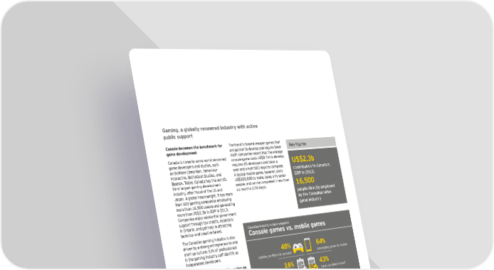 Gaming, a globally renowned industry with active p ublic sup p ort Canada becomes the benchmark for T h e t rend is t ow ard ch eaper games t h at Keq Õ_ures game develop ment are q u ick er t o develop and req u ire few er Canada is h ome t o some w orld- renow ned st aff: companies report t h at t h e average game developers and st u dios, su ch console game cost s U S $ 8 . 7 m t o develop, as B ioW are E dmont on, B eh aviou r req u ires 6 5 developers and t ak es a U S $ 2 . 3 b Int eract ive, B at t leG oat S t u dios, and y ear and a h alf ( 5 8 3 day s) t o complet e. contribution to ;ana\aÌs B eenox . T oday , Canada h as t h e w orld’ s A t y pical mob ile game, h ow ever, cost s ?