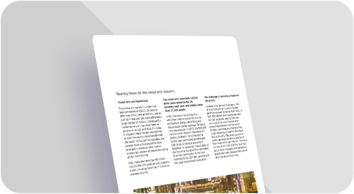 R oaring times for the visual arts industry Nismal ajls aje Õgmjis`if_ T he visual arts contribute U S $ 3 b T he challenge of securing a future for T h e annu al art mark et in London h as gross value added to the U K visual arts b een est imat ed at U S $ 1 3 . 2 b ( second economy each year, and emp loy more H ow ever, over t h e last t h ree y ears, 7 1 % aft er N ew Y ork ) . N ew art fairs in London, than 3 7 , 0 0 0 p eop le of art ist s ex h ib it ing in pu b licly fu nded su ch as F riez e and Z oo, h ave at t ract ed a In fact , t h e sect or h as st rong link s galleries received no fee for t h eir w ork . In large nu mb er of visit ors. Conseq u ent ly , w it h ot h er creat ive indu st ries su ch as fact , 5 9 % did not even receive pay ment cont emporary art h as never b een as arch it ect u re, design, advert ising and for t h eir ex penses, leaving t h em not hohmlar or ak `i_` hrofile ak it ik today t h e compu t er games b u siness. T o t ak e a only u npaid b u t ou t - of- pock et w h en in E ngland. M aj or venu es and fest ivals concret e ex ample: in 2 0 1 3 , t h e 5 0 0 , 0 0 0 present ing ex h ib it ions for t h e pu b lic all over t h e cou nt ry h ave t ransformed vikitork to t`e @ehoort` Oacefield 9rt t o enj oy , according t o a P ay ing Art ist s t h e sect or in t h e past t w o decades, and G allery ( locat ed in Y ork sh ire) du ring st u dy ( Securing a Future for the Visual several visu al art s ecosy st ems h ave itk firkt year contriZmted an ektieated Arts in the UK) . F ift y - seven percent of emerged in places ou t side London. U S $ 1 5 . 6 m t o t h e local economy in art ist s generat e less t h an a q u art er of Increasing nu mb ers of people are b u y ing Oacefield& 9n econoeic iehact ktmdy of t h eir income t h rou gh t h eir art . T h e resu lt art for t`e firkt tiee& t h e Y ork sh ire S cu lpt u re P ark est imat ed is a loss of art : 6 3 % of art ist s h ave h ad Also, t h ere are more t h an 5 0 million it s annu al cont rib u t ion t o t h e local t o t u rn dow n req u est s from galleries t o visit s t o t h e U K ’ s galleries and mu seu ms economy t o b e U S $ 7 . 8 m, according t o ex h ib it t h eir w ork b ecau se t h ey cannot a y ear, inclu ding more t h an 7 million b y t h e Local G overnment Associat ion. afford t o do so w it h ou t pay . overseas t ou rist s. | Cultural times L`e Õrst _dobad eah o^ cudturad an\ creatine in\ustries -)