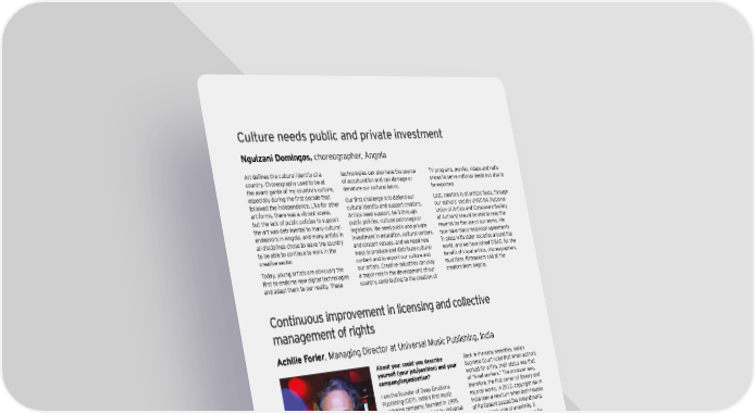 ;udture nee\s hubdic an\ hrinate innesteent N guizani Domingos, ch oreograph er, Angola 9rt definek t`e cmltmral identity of a t ech nologies can also h ave t h e sou rce T V programs, movies, videos and radio cou nt ry . Ch oreograph y u sed t o b e at of accu lt u rat ion and can damage or sh ow s t o serve nat ional needs b u t also t o t h e avant - garde of my cou nt ry ’ s cu lt u re, denat u re ou r cu lt u ral fab ric. b e ex port ed. ekhecially dmrin_ t`e firkt decade t`at Gmr firkt c`allen_e ik to defend omr Dakt$ creatork in all artiktic fieldk$ t`rom_` follow ed t h e independence. Lik e for ot h er cu lt u ral ident it y and su pport creat ors. ou r au t h ors’ societ y U N S C- S A ( N at ional art forms, t h ere w as a vib rant scene, Art ist s need su pport , b e it t h rou gh U nion of Art ist s and Composers- S ociet y b u t t h e lack of pu b lic policies t o su pport pu b lic policies, cu lt u ral pat ronage or of Au t h ors) sh ou ld b e ab le t o reap t h e t h e art w as det riment al t o many cu lt u ral legislat ion. W e need pu b lic and privat e rew ards for t h e u se of ou r w ork s. W e endeavors in Angola, and many art ist s in invest ment in edu cat ion, cu lt u ral cent ers, now h ave many reciprocal agreement s all disciplines ch ose t o leave t h e cou nt ry and concert venu es, and w e need new in place w it h sist er societ ies arou nd t h e t o b e ab le t o cont inu e t o w ork in t h e w ay s t o produ ce and dist rib u t e cu lt u ral w orld, and w e h ave j oined CIS AC, for t h e creat ive sect or. cont ent and t o ex port ou r cu lt u re and Zenefit of vikmal artiktk$ c`oreo_rah`erk$ T oday , y ou ng art ist s are ob viou sly t h e ou r art ist s. Creat ive indu st ries can play emkiciank$ fileeacerk and all t`e firkt to endorke neo di_ital tec`nolo_iek a maj or role in t h e development of ou r creat ors from Angola. and adapt t h em t o ou r realit y . T h ese cou nt ry , cont rib u t ing t o t h e creat ion of ;ontinuous iehroneeent in dicensin_ an\ coddectine eana_eeent o^ ri_`ts A chille F orler, M anaging D irect or at U niversal M u sic P u b lish ing, India A bout you: could you describe B ack in t h e early sevent ies, India’ s yourself ( your j ob/ p osition) and your S u preme Cou rt ru led t h at w h en au t h ors comp any/ organization? oorced for a file$ t`eir ktatmk oak t`at I am t h e fou nder of D eep E mot ions of “ h ired w ork ers. ” T h e produ cer w as, HmZlik`in_ <=H!$ AndiaÌk firkt emkic t`erefore$ t`e firkt ooner of literary and pu b lish ing company , fou nded in 1 9 9 5 . mu sical w ork s. In 2 0 1 2 , copy righ t law in T h e company w as acq u ired b y U niversal India t ook a new t u rn w h en b ot h H ou ses M u sic P u b lish ing ( U M P ) in D ecemb er of P arliament passed t h e Amendment s 2 0 1 2 , and I am now t h e M D of b ot h D E P in a landmark vot e of u nanimit y . It and U M P . cont ained t h ree import ant clau ses for au t h ors: au t h ors gained an u nw aivab le W hat are the p articular asp ects righ t t o roy alt ies eq u ivalent t o 5 0 % of all pu b lish ing income; collect ive licensing of of your industry ( music) in your lit erary and mu sical w ork s cou ld b e done country? only t h rou gh a societ y ; and all regist ered © Ch ant al F orler M ost of t h e mu sic in India is produ ced b y societ ies h ad t o re- apply for a license file hrodmcerk$ o`o t`en kell t`e Zmndled w it h in a y ear. “ mu sic righ t s” t o record lab els ( w h o H ow has your industry changed over w ere t h e t radit ional gat e- k eepers t o t h e the last few years? mark et in t h e age of ph y sical produ ct s) . Andia adohted itk firkt ;ohyri_`t 9ct in India is a u niq u e mark et , remark ab le in 1 9 5 7 , modeled on t h e B rit ish Copy righ t many w ay s. It rank s among t h e h andfu l Act , 1 9 5 6 . U nt il t h e early 1 9 7 0 s, H M V of cou nt ries t h at possess a pow erfu l ( now S aregama) h ad a monopoly over ent ert ainment indu st ry w it h crossover disc manu fact u ring, h ence t h e pract ice of reach : it s cu lt u ral produ ct s are pu rch ased “ b u ndled righ t s. ” b y consu mers from ot h er cu lt u res. | Cultural times L`e Õrst _dobad eah o^ cudturad an\ creatine in\ustries 9 9
