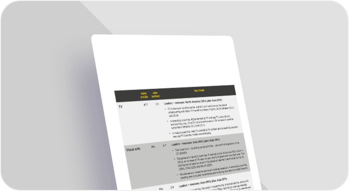 S ales J obs K ey trends ( U S $ b) ( million) T V 4 7 7 3 . 5 L eaders — revenues: N orth A merica ( 3 8 % ) ; j obs: A sia ( 5 5 % ) • T V is t h e most lu crat ive sect or and w ill cont inu e t o b e so: t h e glob al b roadcast ing and cab le T V mark et is forecast t o grow 2 4 . 3 % b et w een 2 0 1 3 and 2 0 1 8 . • In emerging cou nt ries, digit al t errest rial T V and pay - T V su b script ions are b ooming, e. g. , D irecT V Lat in America saw a 1 5 % increase in sat ellit e su b scrib ers b et w een 2 0 1 2 and 2 0 1 3 . • In mat u re cou nt ries, w eb T V and digit al T V cont ent are increasingly popu lar; new pay - T V b u siness models are emerging. Nisuad arts 3 9 1 6 . 7 L eaders — revenues: A sia ( 4 9 % ) ; j obs: A sia ( 4 9 % ) • L`e vikmal artk È inclmdin_ varied activitiek È are t`e firkt eehloyerk in t`e CCI glob ally . • T h e glob al art mark et is b ooming: it reach ed a t ot al of j u st over € 5 1 b illion in 2 0 1 4 , an increase of 7 % y ear- on- y ear and it s h igh est - ever recorded level. T h e dist rib u t ion of sales b y valu e in t h e glob al art mark et is dominat ed b y t h e U S ( 3 9 % ) , Ch ina ( 2 2 % ) and t h e U K ( 2 2 % ) . • S imu lt aneou sly , mu seu ms are mu sh rooming, especially in emerging cou nt ries, creatin_ neo conkmeer epheriencek and enaZlin_ neo oayk to create fine artk& Neoshahers 3 5 4 2 . 9 L eaders — revenues: A sia ( 4 0 % ) ; j obs: A sia ( 5 7 % ) an\ ea_arines • In mat u re cou nt ries, t h e sect or is ex periencing st ru ct u ral decline, and a sh ift t o online edit ions, e. g. , The New York Times report ed an average w eek day print circu lat ion of less t h an 6 5 0 , 0 0 0 in S ept emb er 2 0 1 4 , b u t it s w eb sit e and associat ed apps at t ract ed nearly 5 4 million u niq u e visit ors in J anu ary 2 0 1 5 . H ow ever, t h e digit al revenu es do not compensat e for t h e losses of print t oday . • In emerging cou nt ries, print new spapers is b ooming. Ch ina and India comb ined w ill accou nt for an ast onish ing 5 7 . 3 % of glob al average daily u nit print circu lat ion in 2 0 1 9 , u p from 4 9 . 7 % in 2 0 1 4 . • T ot al magaz ines revenu es w ill remain on an u pw ard cu rve t o 2 0 1 9 , driven b y a 1 . 5 % grow t h in t rade magaz ine revenu e. 9\nertisin_ 2 8 5 2 . 0 L eaders — revenues: E U ( 5 0 % ) ; j obs: E U ( 5 0 % ) • Advert ising is especially import ant ; it is feeding t h e ot h er CCI ( new spapers and magaz ines, radio, T V , et c. ) , and glob al advert ising revenu es w ill increase U S $ 3 0 0 million b et w een 2 0 1 0 and 2 0 1 9 . • P rint ads h ave fallen off and ad spending is moving t o digit al. D igit al advert ising w ill b ecome t h e largest advert ising segment in 2 0 1 9 . T h e rapid grow t h ( 2 3 . 1 % ) of mob ile int ernet advert ising revenu es means t h at it w ill overt ak e display b y t h e end of t h e forecast period. • In emerging cou nt ries, advert ising in general is b ooming, e. g. , Lat in America h olds t h e same nu mb er of advert ising j ob s as N ort h America. T h e rising mark et s are forecast t o cont rib u t e 6 2 % of addit ional ad ex pendit u res b et w een 2 0 1 2 and 2 0 1 5 , increasing t h eir sh are of t h e glob al mark et t o 3 7 % . | Cultural times L`e Õrst _dobad eah o^ cudturad an\ creatine in\ustries 1)