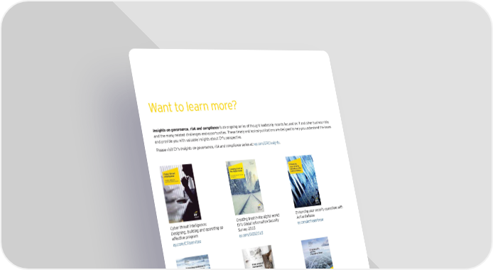 Want to learn more? Insights on governance, risk and compliance is an ongoing series of thought leadership reports focused on IT and other business risks and the many related challenges and opportunities. These timely and topical publications are designed to help you understand the issues and provide you with valuable insights about EY’s perspective. Please visit EY’s Insights on governance, risk and compliance series at: ey.com/GRCinsights. Cyber threat intelligence: Creating trust in the digital world: Enhancing your security operations with Designing, building and operating an EY’s Global Information Security Active Defense effective program Survey 2015 ey.com/activedefense ey.com/CTIservices ey.com/GISS2015 Achieving resilience in the cyber ecosystem Cyber program management: identifying Cybersecurity and the Internet of Things ey.com/cyberecosystem ways to get ahead of cybercrime ey.com/IoT ey.com/CPM Using cyber analytics to help you get There’s no reward without risk: Unlocking the value of your program on top of cybercrime: Third-generation EY’s global governance, risk and investments: How predictive analytics can Security Operations Centers compliance survey 2015 help in achieving successful outcomes ey.com/3SOC ey.com/GRCsurvey2015 ey.com/PRM 16 | @ow do you Ônd the criminals before they commit the cybercrime? — A close look at cyber threat intelligence