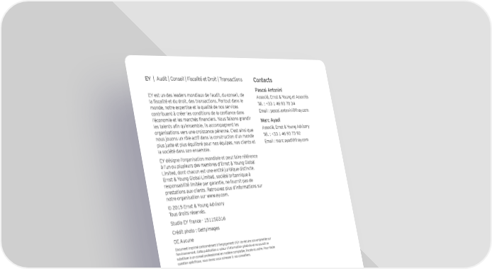 EY | Audit | Conseil | Fiscalité et Droit | Transactions Contacts Pascal Antonini EY est un des leaders mondiaux de l’audit, du conseil, de Associé, Ernst & Young et Associés la fiscalité et du droit, des transactions. Partout dans le Tél. : +33 1 46 93 70 34 monde, notre expertise et la qualité de nos services Email : [email protected] contribuent à créer les conditions de la confiance dans l’économie et les marchés financiers. Nous faisons grandir Marc Ayadi les talents afin qu’ensemble, ils accompagnent les Associé, Ernst & Young Advisory organisations vers une croissance pérenne. C’est ainsi que nous jouons un rôle actif dans la construction d’un monde Tél. : +33 1 46 93 73 92 plus juste et plus équilibré pour nos équipes, nos clients et Email : [email protected] la société dans son ensemble. EY désigne l’organisation mondiale et peut faire référence à l’un ou plusieurs des membres d’Ernst & Young Global Limited, dont chacun est une entité juridique distincte. Ernst & Young Global Limited, société britannique à responsabilité limitée par garantie, ne fournit pas de prestations aux clients. Retrouvez plus d’informations sur notre organisation sur www.ey.com. © 2015 Ernst & Young Advisory Tous droits réservés. Studio EY France - 1511SG316 Crédit photo : GettyImages DE Aucune Document imprimé conformément à l’engagement d’EY de réduire son empreinte sur l’environnement. Cette publication a valeur d’information générale et ne saurait se substituer à un conseil professionnel en matière comptable, fiscale ou autre. Pour toute question spécifique, vous devez vous adresser à vos conseillers. ey.com/fr