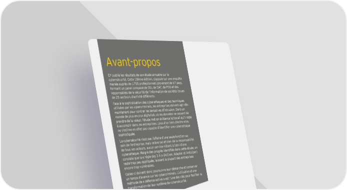 Avant-propos EY publie les résultats de son étude annuelle sur la cybersécurité. Cette 18ème édition, s’appuie sur une enquête menée auprès de 1755 professionnels provenant de 67 pays, formant un panel composé de DSI, de DAF, de PDG et des responsables de la sécurité de l’information de sociétés issues de 25 secteurs d’activité différents. Face à la sophistication des cyberattaques et des techniques utilisées par les cybercriminels, les entreprises doivent agir dès maintenant pour contrer les tentatives d’intrusion. Dans un monde de plus en plus digitalisé, où les données ne cessent de prendre de la valeur, l’étude met en évidence le travail qu’il reste à accomplir dans les entreprises : plus d’un tiers d’entre-elles ne s’estime en effet pas capable d’identifier une cyberattaque sophistiquée. La cybersécurité n’est pas l’affaire d’une seule fonction au sein de l’entreprise, mais relève bel et bien de la responsabilité de tous ses acteurs, aucun service n’étant à l’abri d’une cyberattaque. Malgré des progrès identifiés dans cette étude, on constate que la « règle des 3 A » (Activer, Adapter et Anticiper) reste trop peu appliquée, laissant la plupart des entreprises encore trop vulnérables. Celles-ci doivent donc poursuivre leur démarche et conserver un temps d’avance sur les cybercriminels. L’utilisation d’une méthode de « défense active » est l’une des clés pour faciliter la transformation de leur système de cybersécurité. Pourquoi votre entreprise est-elle toujours Quand digital rime Comment se aussi vulnérable ? Se tourner avec cyberattaque déroulent les • Pas suffisamment vers la • Un environnement cyberattaques ? de mesures prises « défense active » digitalisé qui évolue • Identifier des dans l’environnement • Qu’est-ce que la sans cesse scénarii catastrophe actuel « défense active » ? • Quelles menaces • Détecter les signaux • Pas assez • Comment construire et quelles faibles d’adaptation au une « défense active » ? vulnérabilités • Pourquoi rester changement • Conduisez votre craindre ? en alerte ? • Une approche entreprise sur la • Des pistes proactive trop lente voie du progrès pour freiner les pour neutraliser cyberattaques