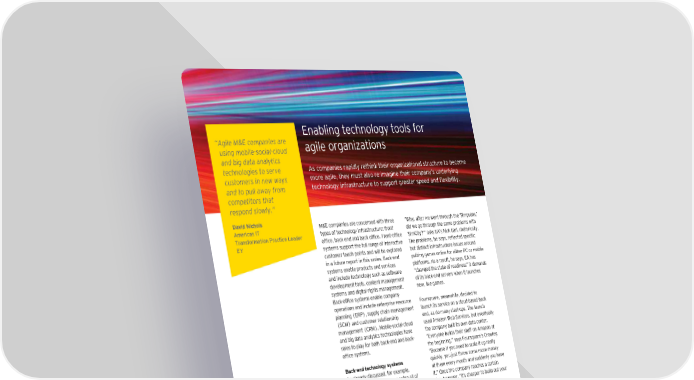 Enabling technology tools or “ †gile M&E companies are agile organiœations using mobile-social-cloud and big data analytics technologies to sere As companies rapidly rethinŒ their organiœational structure to become customers in new ways more agile€ they must also reimagine their company’s underlying and to pull away from technology inrastructure to support greater speed and fleibilityŠ competitors that respond slowly.” aid Nicho M&E companies are concerned ‚ith three “Žhy€ ater ‚e ‚ent through the ‘ impsons€’ ƒmericas “T types o technology inrastructure’ ront did ‚e go through the same problems ‚ith Transformation ©ractice Leader ofice€ bacŒ end and bacŒ oficeŠ Frontofice ‘ imCity®’” asŒs EA’s icŒ Earl€ rhetoricallyŠ EY systems support the ull range o interactive The problems€ he says€ reflected specific customer touch points and ‚ill be eplored but distinct inrastructure issues around in a uture report in this seriesŠ ›acŒend putting games online or either £C or mobile systems enable products and services platormsŠ As a result€ he says€ EA has and include technology such as sot‚are “changed the state o readiness” it demands development tools€ content management o its bacŒend servers ‚hen it launches systems and digital rights managementŠ ne‚€ live gamesŠ ›acŒofice systems enable company operations and include enterprise resource Foursuare€ mean‚hile€ decided to planning ˜E‹£š€ supply chain management launch its service on a cloudbased bacŒ ˜ CMš and customer relationship end€ as do many startupsŠ The launch management ˜C‹MšŠ Mobilesocialcloud used Amaœon Žeb ervices€ but eventually and big data analytics technologies have the company built its o‚n data centerŠ roles to play or both bacŒend and bacŒ “Everyone builds their stu on Amaœon at ofice systemsŠ the beginning€” says Foursuare’s Cro‚leyŠ “›ecause i you need to scale it up really ack•end technoogy yteŠ uicŒly€ you «ust thro‚ some more money As already discussed€ or eample€ at them every month and suddenly you have leading M&E companies are using all o itŠ” ƒnce the company reaches a certain these technologies to help them rapidly siœe€ ho‚ever€ “it’s cheaper to build out your “sense and respond” to changing audience o‚n data centersŠ” preerences and behavior patternsŠ The cloud€ or instance€ has become a proven Žhile Cro‚ley may be right in saying solution or managing the launch o ne‚ that every ne‚ startup uses the cloud or content oerings — maŒing it easier and bacŒend systems€ our research sho‚s more eficient to manage demandŠ that established M&E companies are not universally convincedŠ For eample€ ‡¥” o Electronic Arts ˜EAš learned this the survey respondents are still studying and hard ‚ay€ ‚hen its March ‡…ˆ‰ release piloting their use o cloud or product and o the highly anticipated online version service development€ „¥” are in the process o “ imCity” resulted in multiple crashed o their first deployments and «ust ˆ™” have servers and thousands o angry customersŠ gone on to secondgeneration deploymentsŠ EA underestimated the inrastructure that Further€ „” aren’t considering it ˜see Figure ‚ould be needed to support the game’s ˆ“€ page ‡¨šŠ immediate rush o ansŠ More embarrassing ‚as that the incident tooŒ place less than a year ater the similarly unortunate roll out o a ree mobile game€ “The impson’s’ Tapped ƒut€” ‚hich crashed the company’s servers and caused users’ data and game progress to be erasedŠ ›