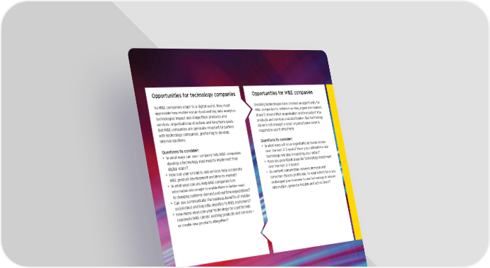 pportunities for technology companies pportunities for M&E companies As M&E companies adapt to a digital ‚orld€ they must Enabling technologies have created an opportunity or appreciate ho‚ mobilesocialcloud and big data analytics M&E companies to rethinŒ ho‚ they ingest inormation€ technologies impact and shape their products and share it around their organiœation and translate it into services€ organiœational structure and longterm goalsŠ products and services and distributionŠ ›ut technology ›ut M&E companies are generally reluctant to partner alone is not enough• a clear organiœational vision is ‚ith technology companies€ preerring to develop reuired to use it eectivelyŠ internal solutionsŠ ¡uestions to consider€ ¡uestions to consider€ • In ‚hat ‚ays ‚ill your organiœational model evolve • In ‚hat ‚ays can your company help M&E companies over the net ‡–‰ years® ‘ave you outlined the role develop a technology road map to implement their technology ‚ill play in realiœing your vision® digital vision® • ‘ave you prioritiœed areas or technology investment • ‘o‚ can your products and services help accelerate over the net ‡–‰ years® M&E product development and time to marŒet® • As content consumption volumes increase and • In ‚hat ‚ays can you help M&E companies turn consumer choices prolierate€ to ‚hat etent have you inormation into insight to enable them to better react challenged your business to use technology to absorb to changing customer demand and real time epectations® inormation€ generate insights and act on them® • Can you communicate the business benefits o mobile socialcloud and big data analytics to M&E customers® • ‘o‚ many ‚ays can your technology be used to help reanimate M&E clients’ eisting products and services — or create ne‚ products altogether® §œ