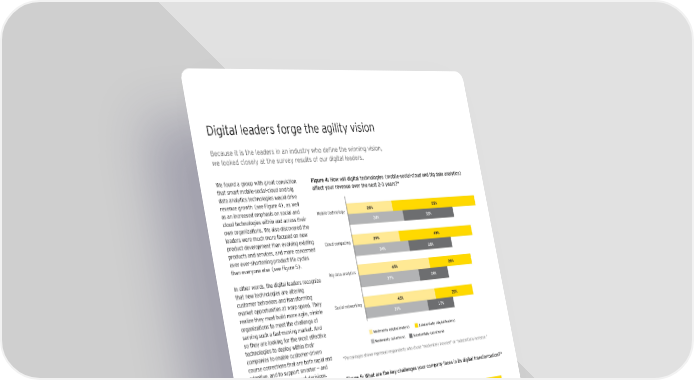 ¦igital leaders orge the agility vision ›ecause it is the leaders in an industry ‚ho define the ‚inning vision€ ‚e looŒed closely at the survey results o our digital leadersŠ Že ound a group ‚ith great conviction Figure 4: £o ill digital technologies ¤mobilesocialcloud and big data analytics¥ that smart mobilesocialcloud and big affect your reenue oer the ne‡t years…¦ data analytics technologies ‚ould drive revenue gro‚th ˜see Figure ¥š€ as ‚ell as an increased emphasis on social and Mobile technology 28% 55% cloud technologies ‚ithin and across their 34% 33% o‚n organiœationsŠ Že also discovered the leaders ‚ere much more ocused on ne‚ product development than evolving eisting Cloud computing 29% 48% products and services€ and more concerned over evershortening product lie cycles 34% 28% than everyone else ˜see Figure „šŠ Big data analytics 45% 28% In other ‚ords€ the digital leaders recogniœe that ne‚ technologies are altering 37% 19% customer behaviors and transorming marŒet opportunities at ‚arp speedŠ They 45% 25% realiœe they must build more agile€ nimble Social networking organiœations to meet the challenge o 39% 17% serving such a astmoving marŒetŠ And so they are looŒing or the most eective Moderately (digital leaders) Substantially (digital leaders) technologies to deploy ‚ithin their companies to enable customerdriven Moderately (all others) Substantially (all others) course corrections that are both rapid and ¡£ercentages sho‚n represent respondents ‚ho chose “moderately increase” or “substantially increaseŠ” adaptive€ and to support smarter — and much aster — management decisionsŠ Figure ‚: „hat are the ‚ey challenges your company faces in its digital transformation…¦ Implementing this vision o an agile ¤Select the top three) organiœation constantly delivering ne‚ products and services to match the rapid evolution o customer tastes and habits is Shortening life cycle of 42% a tall orderŠ Conseuently€ our research our products/services 28% reveals gaps bet‚een the vision and its eecution€ even among the leaders and Operating in new 38% certainly among the restŠ geographic markets 32% Incorporating new digital 38% technologies into our products and systems 26% Coping with new digital 32% business models 40% Increasing competition 26% from firms with superior digital capabilities 32% Digital leaders All others ¡£ercentages sho‚n represent respondents ‚ho ranŒed each choice first€ second or thirdŠ ¢