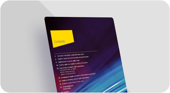 Contents 4 erie of the Digital Leadership Study Series 6 Digital is rapidly transforming media and entertainment 9 Digital leaders forge the agility ision 18 Creating agility and enabling a culture of innoation 21 Case studies€ deeloping agile organiations Foursuare’s startup culture etfli’s fleible approach potiy’s suads and tribes 23 Competing for people and s‚ills in a fastchanging enironment 26 Enabling technology tools for agile organiations 31 utloo‚€ Insights rom our Agility Inde ƒc‚noledgments 33 Source notes 34 Contacts