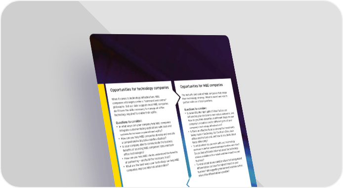 pportunities for technology companies pportunities for M&E companies Žhen it comes to technology inrastructure€ M&E The maturity and scale o M&E companies help shape companies still largely preer a “command and control” their technology strategyŠ Žhen to invest and ‚ho to philosophyŠ ›ut our data suggests most M&E companies partner ‚ith are critical uestionsŠ don’t have the sŒills necessary to manage all o the technology reuired to enable their agilityŠ ¡uestions to consider€ • Is o‚nership the right option® Žhat actors are ¡uestions to consider€ influencing your decision to o‚n versus outsource€ and • In ‚hat ‚ays can your company help M&E companies ho‚ do you thinŒ about this at dierent stages in your integrate customeracing applications ‚ith bacŒend company’s evolution and or dierent parts o your systems to increase organiœational agility® company’s technology inrastructure® • ‘o‚ can you help M&E companies develop and eecute • Is there an eective balance among the investments a comprehensive big data analytics strategy® being made in technology or the ront ofice€ bacŒ • Is your company able to communicate the business ofice and the bacŒ end€ and ho‚ do you thinŒ about benefits o sourcing M&E companies’ data and bacŒ these dierently® ofice technologies® • To ‚hat etent do you ‚orŒ ‚ith your technology • ‘o‚ can you help M&E clients understand the benefits partners to better understand opportunities and risŒs® o partnering — and build the necessary trust® ¦o you eel suficiently inormed about the technology • Žhat are the best ‚ays your technology can help M&E choices available in the marŒet and their impact on your companies improve internal collaboration® business® • To ‚hat etent do you consider ‚here technologybased dierentiation can have the highest impact on your business® Žill suggesting standardiœed solutions sufice€ ‚here little dierentiation is possible® ¨