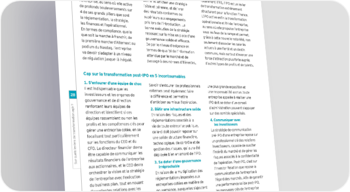 l’IPO se révèle être un excellent Celle-ci va devoir également notamment IFRS, l’IPO est un levier catalyseur de la transformation de définir et afficher une stratégie de transformation extrêmement l’entreprise, au sens où elle active lisible et pérenne, et délivrer structurant pour la fonction Finance. de profonds bouleversements sur des résultats conformes ou L’IPO active enfin la transformation 4 de ses grands piliers que sont supérieurs aux engagements opérationnelle et RH de l’entreprise, la réglementation, la stratégie, pris lors de l’introduction. La au sens où elle propulse l’entreprise les finances et l’opérationnel. bonne exécution de la stratégie sous les feux de la rampe et permet, En termes de compliance, quelle reposant sur la mise en place d’une grâce à cette nouvelle notoriété, non que soit la marche à franchir, de gouvernance solide et efficace. seulement d’associer les salariés la première marche d’Alternext au De par le niveau d’exigence en actuels à une fierté et un destin podium du Nasdaq, l’entreprise termes de qualité de l’information communs, mais surtout d’exercer une va devoir s’adapter à un niveau attendue par le marché et de force d’attraction plus forte auprès de régulation jusque-là inégalé. passage à des normes différentes, d’autres types de profils et de talents. Cap sur la transformation post-IPO en 5 incontournables 1. S’entourer d’une équipe de choc Savoir s’entourer de professionnels une plus grande exposition et Il est indispensable que les externes peut également faire une responsabilité accrue, toute 2828 investisseurs et les organes de la différence et permettre entreprise appelée à réaliser une gouvernance et de direction d’anticiper au mieux l’opération. IPO doit se doter d’un conseil ?? rr renforcent leurs équipes de ii d’administration pouvant s’appuyer gg direction et identifient si ces 2. Bâtir une infrastructure solide n an a sur des comités spécialisés. oo En raison des risques et des ii tt équipes rassemblent ou non les aa règlementations associés à la 4. C ommuniquer avec mm rr profils et les compétences clés pour oo ff vie de toute entreprise publique, les investisseurs ss nn gérer une entreprise cotée, en se aa rr celle-ci doit pouvoir reposer sur La stratégie de communication e te t focalisant tout particulièrement une solide structure financière, pré-IPO d’une entreprise repose sur s ds d rr sur les fonctions du CEO et du ee ii technologique, de contrôle et de un professionnel clé des relations vv ee CFO. Le directeur financier devra s ls l investisseurs, capable de susciter ll gestion des risques, qui aura été ee uu être capable de communiquer les déployée bien en amont de l’IPO. l’intérêt du marché et de gérer les r qr q uu résultats financiers de l’entreprise SS 3. S e doter d’une gouvernance risques associés à la confidentialité aux actionnaires, et le CEO devra irréprochable de l’opération. Post-IPO, c’est sur orchestrer la vision et la stratégie En raison de la multiplication des l’Investor Relation que repose la de l’entreprise avec l’exécution réglementations imposées aux communication de l’entreprise à du business plan, tout en nouant entreprises cotées en matière de l’égard des marchés. Afin de garantir d’excellentes relations avec les gouvernance, auxquelles s’ajoutent une performance solide post-IPO, parties prenantes de l’entreprise. les messages clés de l’entreprise