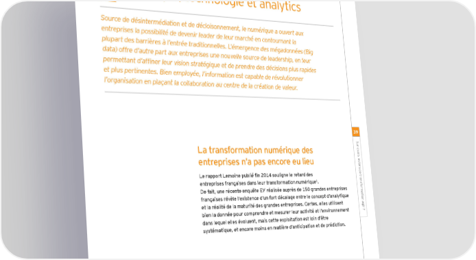 155 Numérique, technologie et analytics Source de désintermédiation et de décloisonnement, le numérique a ouvert aux entreprises la possibilité de devenir leader de leur marché en contournant la plupart des barrières à l’entrée traditionnelles. L’émergence des mégadonnées (Big data) offre d’autre part aux entreprises une nouvelle source de leadership, en leur permettant d’affiner leur vision stratégique et de prendre des décisions plus rapides et plus pertinentes. Bien employée, l’information est capable de révolutionner l’organisation en plaçant la collaboration au centre de la création de valeur. 393939 S u r q u La transformation numérique des e l s l e v i entreprises n’a pas encore eu lieu e r s d Le rapport Lemoine publié fin 2014 souligne le retard des e t r a 1 n entreprises françaises dans leur transformation numérique . s f o r De fait, une récente enquête EY réalisée auprès de 150 grandes entreprises m a t i françaises révèle l’existence d’un fort décalage entre le concept d’analytique o n a et la réalité de la maturité des grandes entreprises. Certes, elles utilisent g i r bien la donnée pour comprendre et mesurer leur activité et l’environnement ? dans lequel elles évoluent, mais cette exploitation est loin d’être systématique, et encore moins en matière d’anticipation et de prédiction. 1 Rapport Lemoine, « Transformation numérique de l’économie », novembre 2014
