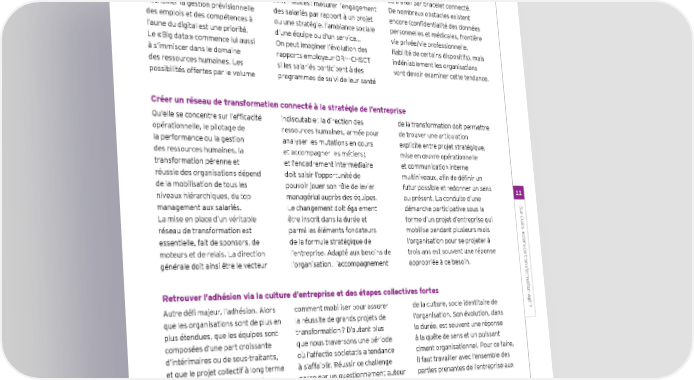 totalement. Pour anticiper ces croissant de données disponibles au travail par bracelet connecté. phénomènes, renouveler et sont inédites : mesurer l’engagement De nombreux obstacles existent intensifier la gestion prévisionnelle des salariés par rapport à un projet encore (confidentialité des données des emplois et des compétences à ou une stratégie, l’ambiance sociale personnelles et médicales, frontière l’aune du digital est une priorité. d’une équipe ou d’un service… vie privée/vie professionnelle, Le « Big data » commence lui aussi On peut imaginer l’évolution des fiabilité de certains dispositifs), mais à s’immiscer dans le domaine rapports employeur-DRH-CHSCT indéniablement les organisations des ressources humaines. Les si les salariés participent à des vont devoir examiner cette tendance. possibilités offertes par le volume programmes de suivi de leur santé Créer un réseau de transformation connecté à la stratégie de l’entreprise Qu’elle se concentre sur l’efficacité indiscutable ; la direction des de la transformation doit permettre opérationnelle, le pilotage de ressources humaines, armée pour de trouver une articulation la performance ou la gestion analyser les mutations en cours explicite entre projet stratégique, des ressources humaines, la et accompagner les métiers ; mise en œuvre opérationnelle transformation pérenne et et l’encadrement intermédiaire et communication interne réussie des organisations dépend doit saisir l’opportunité de multiniveaux, afin de définir un de la mobilisation de tous les pouvoir jouer son rôle de levier futur possible et redonner un sens 1111 niveaux hiérarchiques, du top managérial auprès des équipes. au présent. La conduite d’une S management aux salariés. Le changement doit également démarche participative sous la u r q La mise en place d’un véritable être inscrit dans la durée et forme d’un projet d’entreprise qui u e l s l réseau de transformation est parmi les éléments fondateurs mobilise pendant plusieurs mois e v i e essentielle, fait de sponsors, de de la formule stratégique de l’organisation pour se projeter à r s d moteurs et de relais. La direction l’entreprise. Adapté aux besoins de trois ans est souvent une réponse e t r a générale doit ainsi être le vecteur l’organisation, l’accompagnement appropriée à ce besoin. n s f o r m a t i o Retrouver l’adhésion via la culture d’entreprise et des étapes collectives fortes n a g i Autre défi majeur, l’adhésion. Alors comment mobiliser pour assurer de la culture, socle identitaire de r que les organisations sont de plus en la réussite de grands projets de l’organisation. Son évolution, dans ? plus étendues, que les équipes sont transformation ? D’autant plus la durée, est souvent une réponse composées d’une part croissante que nous traversons une période à la quête de sens et un puissant d’intérimaires ou de sous-traitants, où l’affectio societatis a tendance ciment organisationnel. Pour ce faire, et que le projet collectif à long terme à s’affaiblir. Réussir ce challenge il faut travailler avec l’ensemble des est étranglé par le court-termisme, passe par un questionnement autour parties prenantes de l’entreprise aux