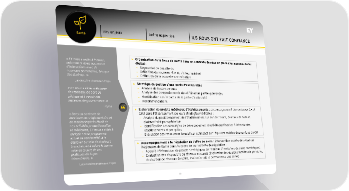 Santé vos enjeux notre expertise ILS NOUS ONT FAIT CONFIANCE «EY nous a aidés à innover, Organisation de la force de vente dans un contexte de mise en place d’un nouveau canal notamment dans nos modes digital : d’interactions avec de ‒ Segmentation des clients nouveaux partenaires, tels que ‒ Définition du nouveau rôle du visiteur médical des start-up. » ‒ Définition de la nouvelle sectorisation Laboratoire pharmaceutique Stratégie de gestion d’une perte d’exclusivité : «EY nous a aidés à élaborer ‒ Analyse de la concurrence des tableaux de bord de ‒ Analyse des comportements des différentes parties prenantes pilotage et à revoir nos ‒ Modélisation des impacts de la perte d’exclusivité instances de gouvernance. » ‒ Recommandations Hôpital Elaboration de projets médicaux d’établissements: accompagnement de nombreux CH et «Dans un contexte de “ CHU dans l’établissement de leurs stratégies médicales : durcissement réglementaire et ‒ Analyse du positionnement de l’établissement sur son territoire, des taux de fuite et de monitoring très étroit de d’attractivité par spécialité nos activités promotionnelles et médicales, EY nous a aidés à ‒ Identification des stratégies de développement d’activité pertinentes à l’échelle des enrichir notre programme établissements et par pôles actuel de conformité, à le ‒ Evaluation des ressources à mobiliser et impact sur l’équilibre médico-économique du CH déployer au sein de plusieurs Accompagnement à la régulation de l’offre de soins : intervention auprès des Agences branches, et à suivre la bonne Régionales de Santé dans le cadre de leur activité de régulation : mise en œuvre de ces pratiques de façon ‒ Appui à l’élaboration de projets stratégiques territoriaux (Territoires de soins numériques) trimestrielle. » ‒ Evaluation des dispositifs ou réseaux existants (évaluation des équipes mobiles de gériatrie, Laboratoire pharmaceutique évaluation de réseaux de soins, évaluation de la permanence des soins) 16