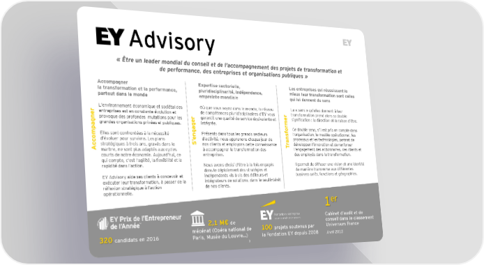 Advisory «Être un leader mondial du conseil et de l’accompagnement des projets de transformation et de performance, des entreprises et organisations publiques » Accompagner Expertise sectorielle, Les entreprises qui réussissent le la transformation et la performance, pluridisciplinarité, indépendance, mieux leur transformation sont celles partout dans le monde empreinte mondiale qui lui donnent du sens Où que vous soyez dans le monde, le réseau Le « sens » qu’elles donnent à leur r L’environnement économique et sociétal des transformation prend alors sa double entreprises est en constante évolution et de compétences pluridisciplinaires d’EY vous ne provoque des profondes mutations pour les r garantit une qualité de service équivalente et signification : la direction et la raison d’être. ag grandes organisations privées et publiques. intégrée. ormerfCe double sens, s’il est pris en compte dans ompElles sont confrontées à la nécessité Présents dans tous les grands secteurs s l’organisation, le modèle opérationnel, les engage processus et les technologies, permet de d’évoluer pour survivre. Les plans d’activité, nous apprenons chaque jour de c ’ ran S Ac stratégiques à trois ans, gravés dans le nos clients et employons cette connaissance T développer l’innovation et de renforcer marbre, ne sont plus adaptés aux cycles à accompagner la transformation des l’engagement des actionnaires, des clients et entreprises. des employés dans la transformation. courts de notre économie. Aujourd’hui, ce qui compte, c’est l’agilité, la flexibilité et la Il permet de diffuser une vision et une identité rapidité dans l’action. Nous avons choisi d’être à la fois engagés dans le déploiement des stratégies et de manière transverse aux différentes EY Advisory aide ses clients à concevoir et indépendants vis à vis des éditeurs et business units, fonctions et géographies. exécuter leur transformation, à passer de la intégrateurs de solutions, dans le seul intérêt de nos clients. réflexion stratégique à l’action opérationnelle. 1er 2,1 M€ de Cabinet d’audit et de conseil dans le classement 320 candidats en 2016 mécénat (Opéra national de 100 projets soutenus par Universum France Paris, Musée du Louvre…) la Fondation EY depuis 2008 Avril 2015 3