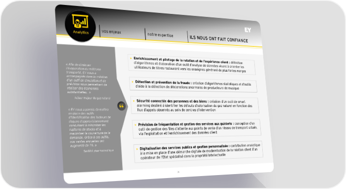 Analytics vos enjeux notre expertise ILS NOUS ONT FAIT CONFIANCE Enrichissement et pilotage de la relation et de l’expérience client : définition d’algorithmes et élaboration d’un outil d’analyse de données visant à orienter les «Afin de diminuer utilisateurs de titres restaurant vers les enseignes générant de plus fortes marges l’évaporation du méthane transporté, EY nous a accompagnés dans la création d’un outil de simulation et de Détection et prévention de la fraude : création d’algorithmes statistiques et d’outils prévision nous permettant de d’aide à la détection de déclarations anormales de producteurs de musique réaliser des économies substantielles. » Acteur majeur du gaz naturel Sécurité connectée des personnes et des biens : création d’un outil de smart alarming destiné à identifier les défauts d’odorisation du gaz naturel en fonction des «EY nous a permis de mettre “ flux d’appels observés au sein de centres d’intervention en place des outils d’identification des facteurs de risques d’approvisionnement conduisant à minimiser les Prévision de fréquentation et gestion des services aux guichets : conception d’un ruptures de stocks et à maximiser la couverture de la outil de gestion des files d’attente aux points de vente d’un réseau de transport urbain, demande. Grâce à ces outils, via l’exploitation et l’enrichissement des données client nos ventes annuelles ont augmenté de 7%. » Société pharmaceutique Digitalisation des services publics et gestion personnalisée : contribution analytique à la mise en place d’une démarche digitale de modernisation de la relation client d’un opérateur de l’Etat spécialisé dans la propriété intellectuelle 38