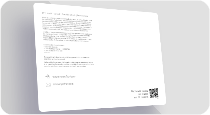 EY | Audit | Conseil | Fiscalité & Droit | Transactions EY est un des leaders mondiaux de l’audit, du conseil, de la fiscalité et du droit, des transactions. Partout dans le monde, notre expertise et la qualité de nos services contribuent à créer les conditions de la confiance dans l’économie et les marchés financiers. Nous faisons grandir les talents afin qu’ensemble, ils accompagnent les organisations vers une croissance pérenne. C’est ainsi que nous jouons un rôle actif dans la construction d’un monde plus juste et plus équilibré pour nos équipes, nos clients et la société dans son ensemble. EY désigne l’organisation mondiale et peut faire référence à l’un ou plusieurs des membres d’Ernst & Young Global Limited, dont chacun est une entité juridique distincte. Ernst & Young Global Limited, société britannique à responsabilité limitée par garantie, ne fournit pas de prestations aux clients. Retrouvez plus d’informations sur notre organisation sur www.ey.com. Advisory © 201 Ernst & Young Advisory. Tous droits réservés. Studio graphique France – 1605SG754. SCORE France N°2016-039 ED 0716 Document imprimé conformément à l’engagement d’EY de réduire son empreinte sur l’environnement. Cette publication a valeur d’information générale et ne saurait se substituer à un conseil professionnel en matière comptable, fiscale ou autre. Pour toute question spécifique, vous devez vous adresser à vos conseillers. www.ey.com/Advisory ; [email protected] * Retrouvez toutes nos études sur EY Insights