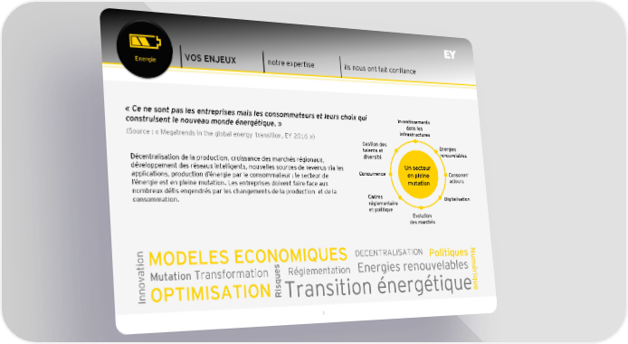 Energie VOS ENJEUX notre expertise ils nous ont fait confiance «Ce ne sont pas les entreprises mais les consommateurs et leurs choix qui Investissements construisent le nouveau monde énergétique. » dans les (Source : « Megatrends in the global energy transition, EY 2016 ») infrastructures Gestion des Energies talents et renouvelables Décentralisation de la production, croissance des marchés régionaux, diversité développement des réseaux intelligents, nouvelles sources de revenus via les Un secteur Concurrence en pleine Consomm’ applications, production d’énergie par le consommateur : le secteur de mutation acteurs l’énergie est en pleine mutation. Les entreprises doivent faire face aux nombreux défis engendrés par les changements de la production et de la Cadres consommation. réglementaire Digitalisation et politique Evolution des marchés onMODELES ECONOMIQUES DECENTRALISATION PolitiquesNu Mutation Transformation Réglementation Energies renouvelables mér ovati isques iqu InnOPTIMISATION RTransition énergétiquee 5