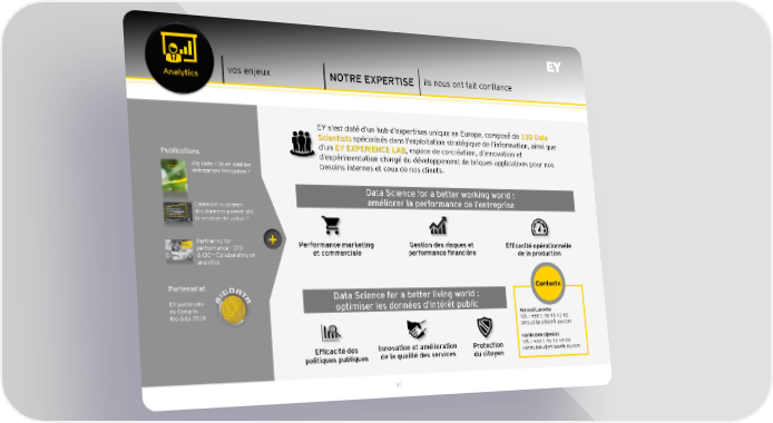 Analytics vos enjeux NOTRE EXPERTISE ils nous ont fait confiance EY s’est doté d’un hub d’expertises unique en Europe, composé de 130 Data Scientists spécialisés dans l’exploitation stratégique de l’information, ainsi que d’un EY EXPERIENCE LAB, espace de co-création, d’innovation et Publications d’expérimentation chargé du développement de briques applicatives pour nos Big Data : Où en sont les besoins internes et ceux de nos clients. entreprises françaises ? Data Science for a better working world : Comment la science améliorer la performance de l’entreprise des données permet-elle la création de valeur ? Partnering for + Performance marketing Gestion des risques et Efficacité opérationnelle performance : CFO et commerciale performance financière de la production & CIO – Collaborating on analytics Partenariat Contacts EY partenaire Data Science for a better living world : du Congrès optimiser les données d’intérêt public Big data 2016 Arnaud Laroche Tél. : +33 1 46 93 41 92 [email protected] Karim Ben Djemiaa Efficacité des Innovation et amélioration Protection Tél. : +33 1 46 93 59 09 politiques publiques de la qualité des services du citoyen [email protected] 37