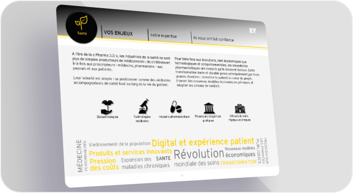 Santé VOS ENJEUX notre expertise ils nous ont fait confiance A l’ère de la « Pharma 3.0 », les industriels de la santé ne sont Pour faire face aux évolutions, tant économiques que plus de simples producteurs de médicaments : ils s’intéressent technologiques et comportementales, les laboratoires à la fois aux prescripteurs - médecins, pharmaciens - aux pharmaceutiques ont compris qu’ils devaient évoluer. Cette payeurs et aux patients. transformation lente et durable passe principalement par trois grands chantiers : remettre le patient au cœur du projet, Leur volonté est simple : se positionner comme des véritables trouver des nouveaux modèles économiques pérennes et accompagnateurs de santé tout au long de la vie du patient. adapter ses canaux de contact. Biotechnologies Technologies Industrie pharmaceutique Financeurs et agences Offreurs de soins, médicales publiques hôpitaux et cliniques E Vieillissement de la population PU LE PRE INEISÉ Digital et expérience patient BLIQU FIS SSIO NNALProduits et services innovants Nouveaux modèles NA N SORPression Expansion des SANTE Révolutionéconomiques ES NCE S MÉDECEPdes coûts maladies chroniques mondiale des soinsTRANSFORMATION S UR 14