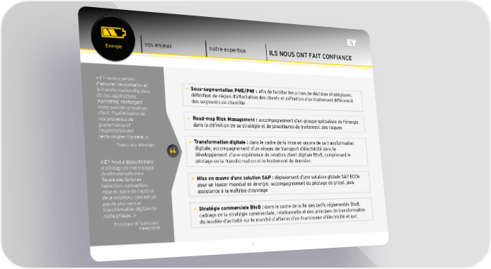 Energie vos enjeux notre expertise ILS NOUS ONT FAIT CONFIANCE «EY nous a permis d’assurer l’exploitation et Sous-segmentation PME/PMI : afin de faciliter les prises de décision stratégiques, la transformation Big data définition de règles d’affectation des clients et définition d’un traitement différencié de nos applications des segments de clientèle marketing, renforçant notre suivi de la relation client, l’optimisation de Road-mapRisk Management : accompagnement d’un groupe spécialiste de l’énergie nos processus de dans la définition de sa stratégie et de procédures de traitement des risques gouvernance et l’exploitation des technologies Big data. » Transformation digitale : dans le cadre de la mise en œuvre de sa transformation Fournisseur d’énergie digitale, accompagnement d’un réseau de transport d’électricité dans le développement d’une expérience de relation client digitale BtoB, comprenant le “ pilotage de la transformation et le traitement de données «EY nous a appuyés dans le pilotage de notre projet de dématérialisation fiscale des factures Mise en œuvre d’une solution SAP : déploiement d’une solution globale SAP ECC6 (sélection, conception, pour un leader mondial en énergie, accompagnement du pilotage de projet, puis mise en place de l’outil et assistance à la maîtrise d’ouvrage de la solution). Ceci est un pas de plus vers la transformation digitale de Stratégie commerciale BtoB : dans le cadre de la fin des tarifs réglementés BtoB, notre groupe. » cadrage de la stratégie commerciale, relationnelle et des principes de transformation Producteur et fournisseur du modèle d’activité sur le marché d’affaires d’un fournisseur d’électricité et gaz d’électricité 7