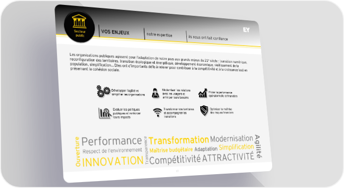 Secteur VOS ENJEUX notre expertise ils nous ont fait confiance public e Les organisations publiques agissent pour l’adaptation de notre pays aux grands enjeux du 21 siècle : transition numérique, reconfiguration des territoires, transition écologique et énergétique, développement économique, vieillissement de la population, simplification… Elles ont d’importants défis à relever pour contribuer à la compétitivité et à la croissance tout en préservant la cohésion sociale. Moderniser les relations Développer l’agilité et avec les usagers et Piloter la performance simplifier les organisations anticiper leurs besoins opérationnelle et financière Evaluer les politiques Transformer nos territoires Optimiser la maîtrise publiques et renforcer et accompagner les des risques financiers leurs impacts transitions urePerformance areencTransformationModernisation Agil Respect de l’environnement Maîtrise budgétaire Simplification OuvertINNOVATION p Adaptation ité TransCompétitivitéATTRACTIVITÉ 17