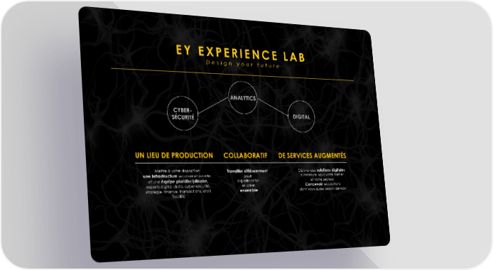 EY EXPERIENCE LAB D e s i g n y o u r f u t u r e ANALYTICS CYBER- DIGITAL SÉCURITÉ UN LIEU DE PRODUCTION COLLABORATIF DE SERVICES AUGMENTÉS Mettre à votre disposition Travailler différemment Délivrer des solutions digitales une infrastructure sécurisée et ouverte, pour sur-mesure pour votre métier et une équipe pluridisciplinaire, expérimenter et votre secteur. experts digital, data, cyber-sécurité, et créer Concevoir les solutions stratégie, finance, transactions, droit, ensemble dont vous aurez besoin demain fiscalité